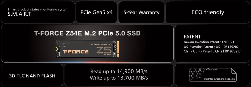 The T-Force Z54E connects through a PCIe 5.0 x4 interface and delivers sequential read speeds of up to 14,900 MB/s across all capacities. Write speeds vary by model, with the 2 TB and 4 TB versions reaching up to 14,000 MB/s, and the 1 TB version up to 13,700 MB/s. These performance levels place the drive among the faster options currently available in the Gen 5 NVMe segment