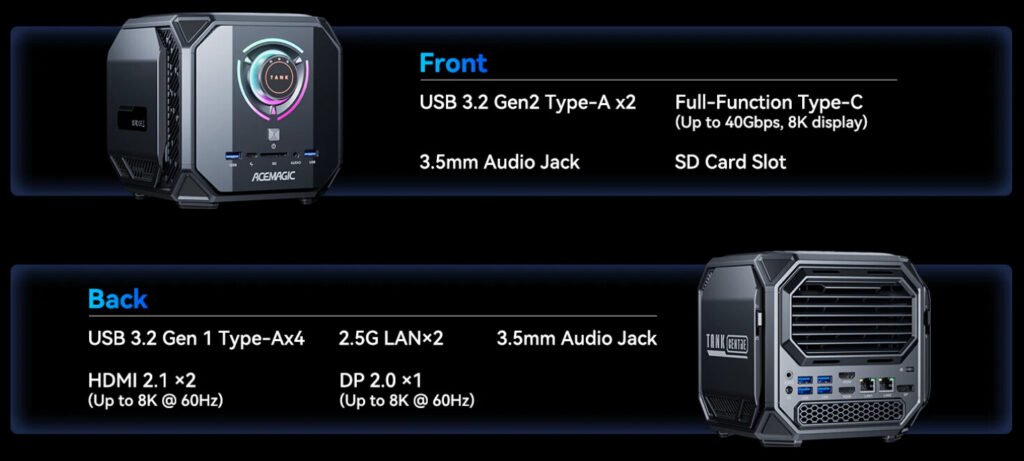 The Tank Centre M1A PRO+ targets users working with AI-focused and advanced computing workloads. It features the AMD Ryzen AI Max+ 395 processor, which is designed to deliver higher efficiency and stronger AI acceleration. According to ACEMAGIC, this model is intended for AI engineers, researchers, and professionals who rely on intensive computational tasks. The I/O configuration differs from the M1A PRO to better suit these use cases.
