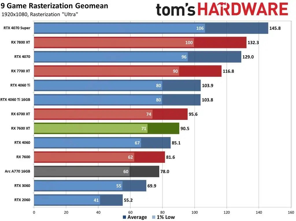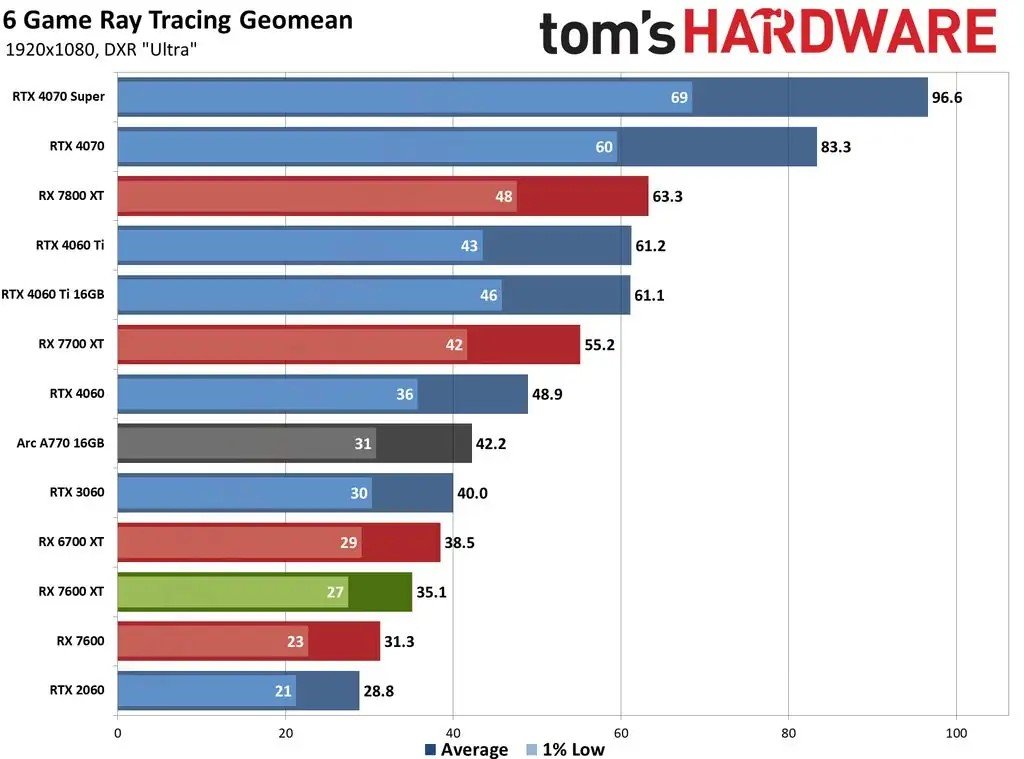 Based on the test findings, the Radeon RX 7600 XT graphics card demonstrates superior overall performance compared to the Intel Arc 770 and GeForce RTX 3060. However, when tested in gaming scenarios at 1080P resolution with the highest graphics settings, including the highest possible ray tracing settings, its speed falls short of matching the Radeon RX 6700 XT and GeForce RTX 4060. Despite outpacing some competitors, the Radeon RX 7600 XT appears to face limitations in specific gaming conditions, particularly at the specified resolution and graphical configurations.