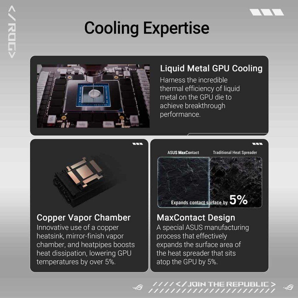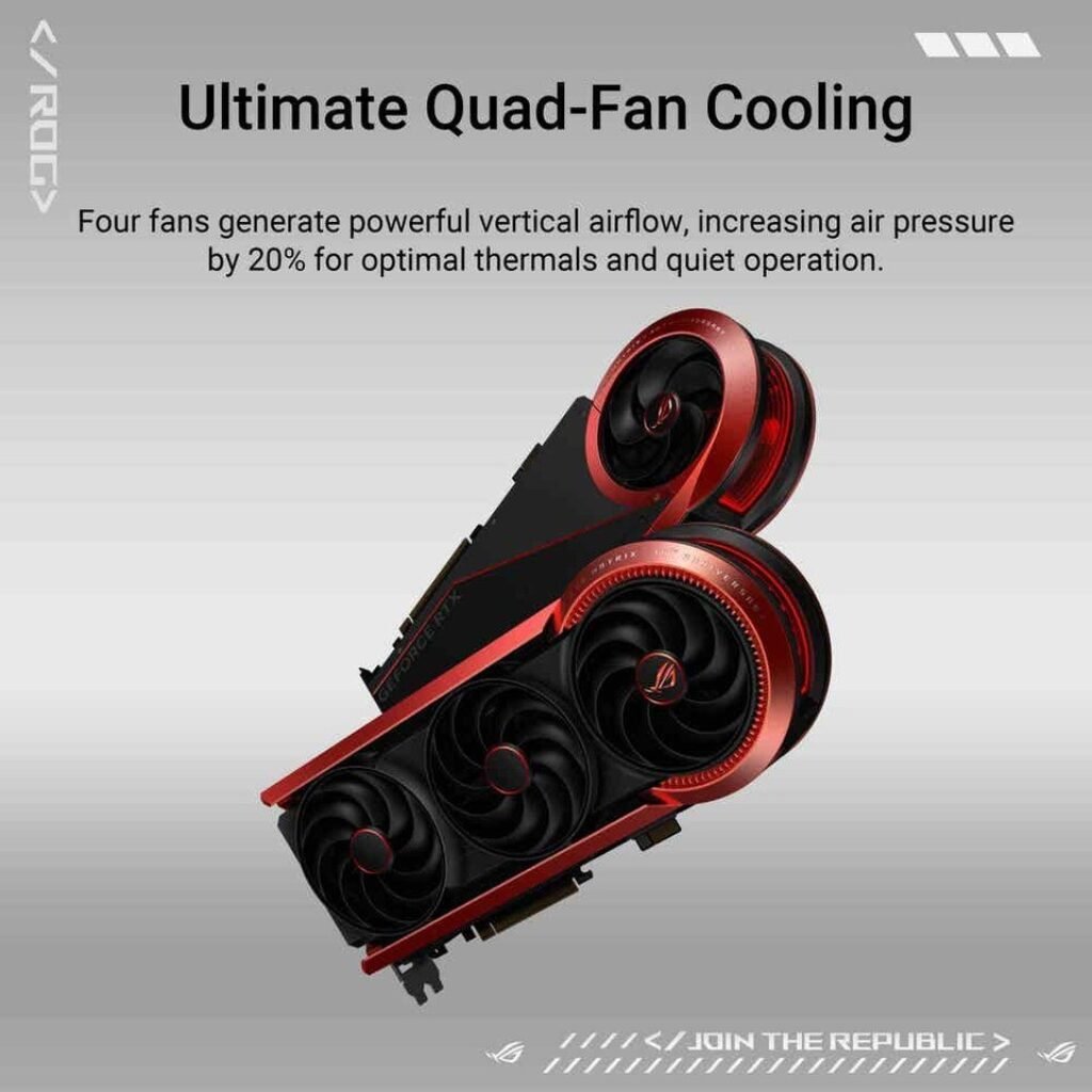 Cooling is managed through a four-fan system, with three fans in the front and one in the back in a push-pull configuration. The shroud carries ASUS’s ROG red theme and includes a distinctive fan ring along with an acrylic plate displaying the ROG MATRIX logo.