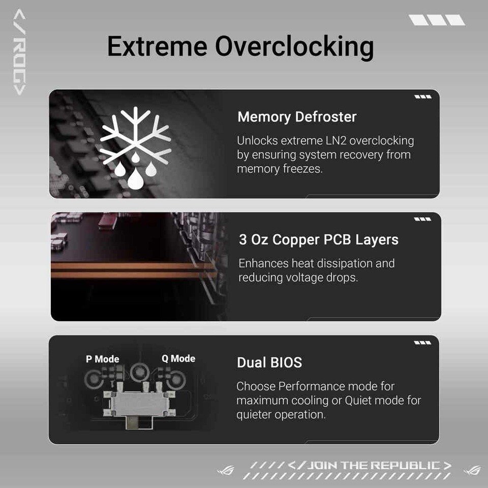 The ROG MATRIX model uses a 3 oz copper PCB to improve heat dissipation and reduce voltage drops across key components. This design is aimed at maintaining stable performance and supporting higher overclocking potential compared to standard models.