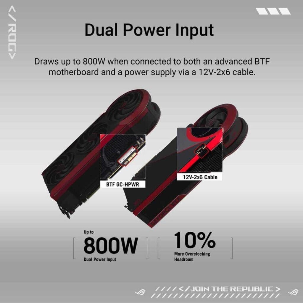 For power delivery, the GPU supports an optional BTF-supplied system and a 16-pin 12V-2×6 connector, allowing for a total power of up to 800 watts, compared with the 575 watts of the standard Founders Edition. ASUS estimates this higher power limit contributes to a 10% increase in performance. The boost clock is listed at 2,730 MHz for standard operation and 2,760 MHz when using the OC BIOS mode.