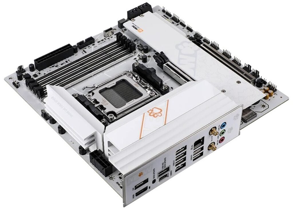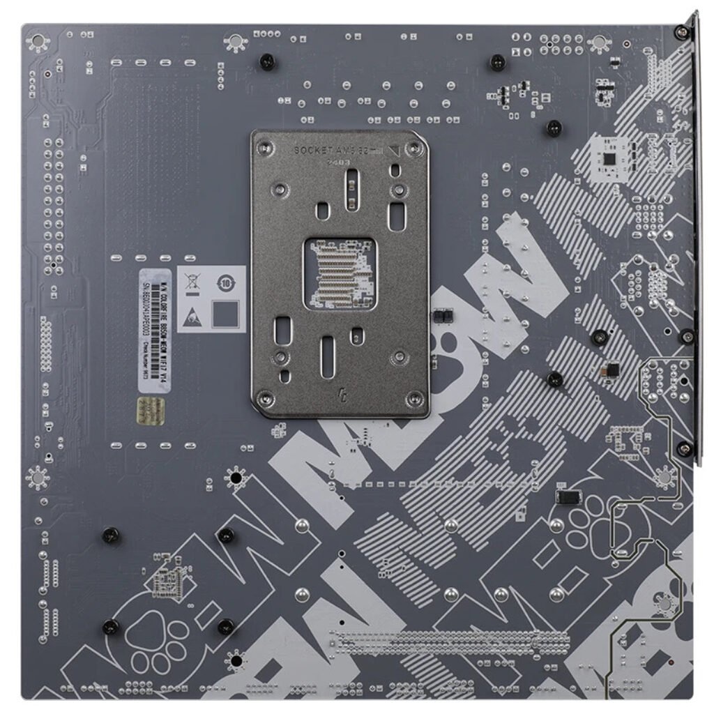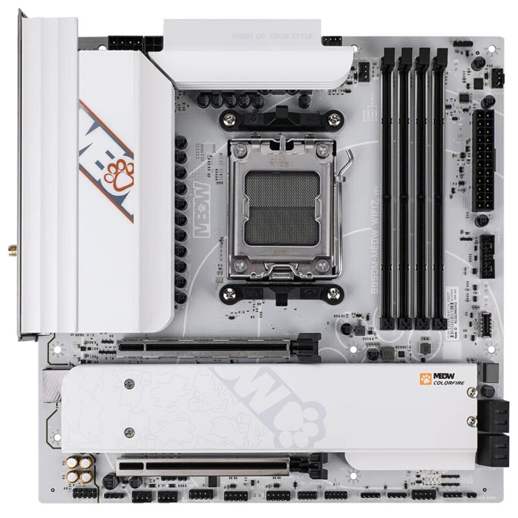 The V14 is positioned as a successor to the earlier B850M MEOW WIFI Orange version. While the older model embraced a more expressive style—featuring large mascot prints, multiple text elements, and dense decorative patterns—the new revision adopts a cleaner, more muted theme. The V14 is primarily white with light paw-print accents and small MEOW logos placed around the PCB. This approach maintains the brand identity while offering a look that may be more suitable for wider audiences, particularly builders who want themed hardware without an overly busy layout.