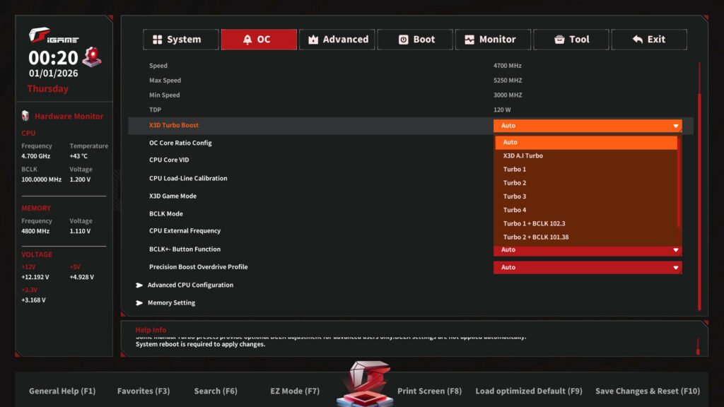 To further optimize AMD X3D processors, COLORFUL has added X3D AI Turbo, a tuning feature exclusive to this flagship model. A dedicated one-click overclocking button on the rear I/O allows users to apply performance settings without entering the BIOS. The BIOS also includes an X3D AI High Frame Rate Mode that automatically adjusts base clock and Precision Boost Overdrive parameters, with additional profiles available for manual tuning.