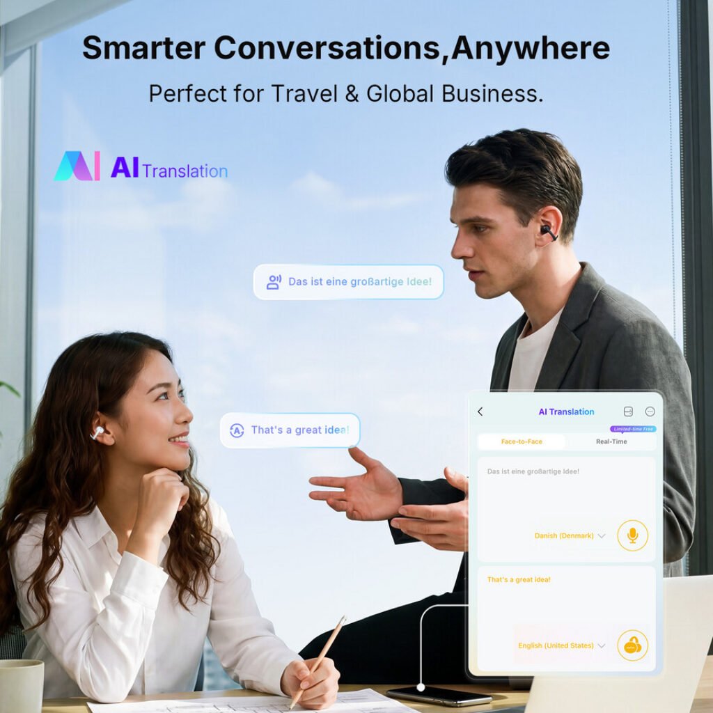 AI translation integrated through EarFun Audio enables real-time translation in over 100 languages, making communication easier during travel or work situations. The feature operates through a connected smartphone and helps reduce language barriers during live conversations.