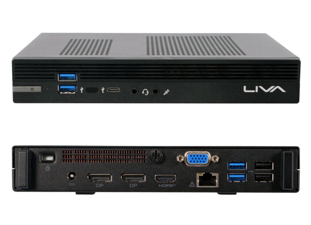 Completing the lineup is the LIVA Q3D, an ultra-compact platform designed for lightweight display and embedded environments. It is available with Intel Pentium Silver N6000 or Celeron N5100 and N4500 processors, includes onboard 4GB or 8GB LPDDR4 memory, and supports storage expansion through eMMC and Micro SD. With dual display support and a footprint of 74 × 74 × 34.6 mm, the LIVA Q3D is suited for space-limited retail endpoints and embedded control systems.