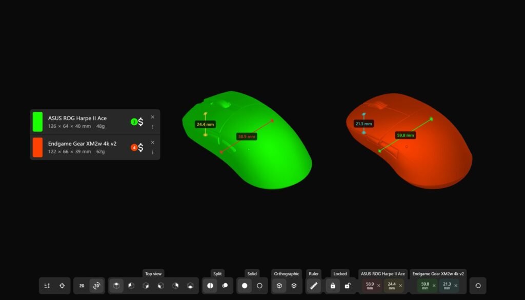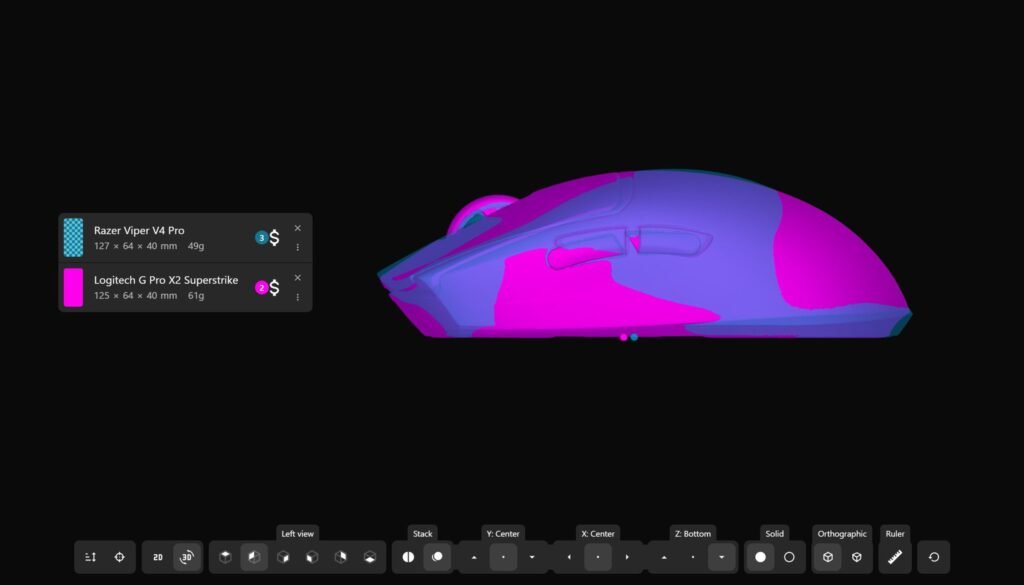 The ability to overlay multiple mouse models within the same view improves direct comparison, which is especially useful when evaluating similar designs. It also provides solid and shaded rendering modes, allowing overlaps and shape differences to be seen more clearly.
