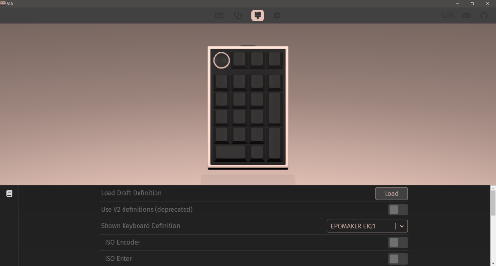 Getting VIA up and running is a quick process. Download the latest version from the official GitHub page, enable the “Use V2 definitions (deprecated)” setting, and then import the EK21 JSON file from Epomaker’s support page. Once the file loads, the configuration tab presents the full layout and available functions. You can adjust keys, add shortcuts, or refine layers as needed, and the changes take effect right away.