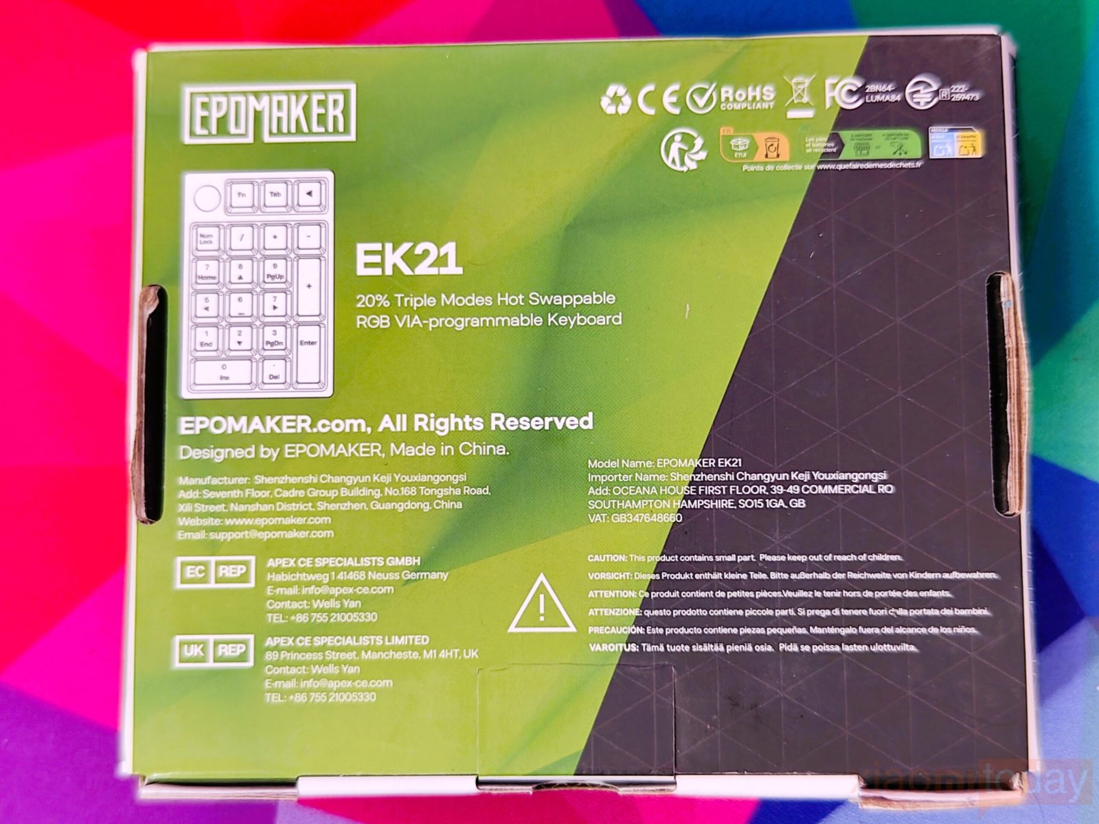 The EPOMAKER EK21 keyboard comes in packaging designed to clearly present its features and layout. The front of the box highlights the EK21 model and describes it as a 20% Triple Mode Hot-Swappable RGB VIA-Programmable Keyboard. A clear visual shows the 20-key layout with the media knob, while icons outline key features such as portability, programmability, and tri-mode connectivity. The back of the box provides compliance, corporate, and cautionary information in a simple, organized format.