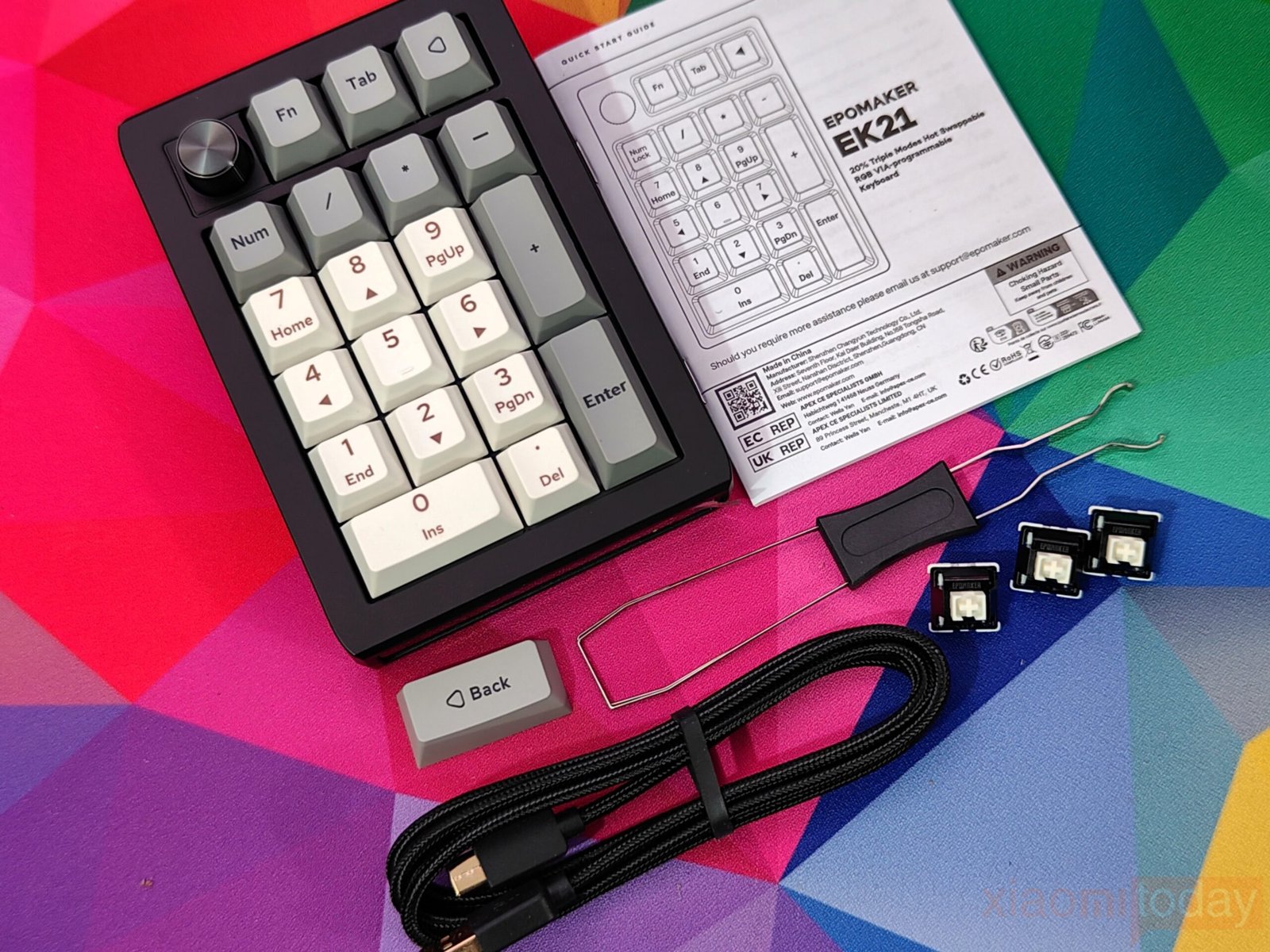 The EPOMAKER EK21 package includes the numpad, a 2-in-1 keycap and switch puller, and an extra “Back” keycap for customization. It also comes with a 1.8-meter detachable USB-A-to-C braided cable and a 2.4GHz wireless dongle, offering both wired and wireless connection options. A multilingual manual provides clear setup instructions, ensuring users can start using the keyboard immediately.