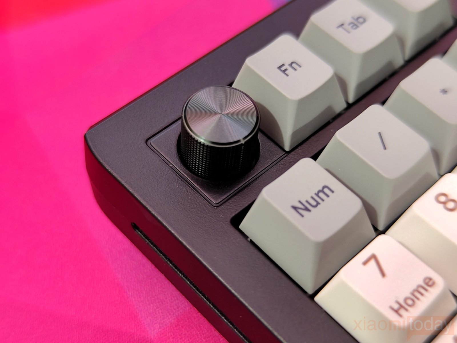 The EK21 comes with PBT keycaps in a Cherry profile, offering durability and resistance to oils while keeping legends clear over time. The cream-colored number keys paired with dark legends, and function keys featuring black fonts on dark grey, create a subtle two-tone look. Each key has a lightly textured surface that improves grip, making typing more comfortable during long sessions. The full aluminum knob at the top left feels solid and smooth, designed for precise control. By default, it adjusts volume but can be reprogrammed through VIA for custom functions, adding flexibility for both work and gaming setups.