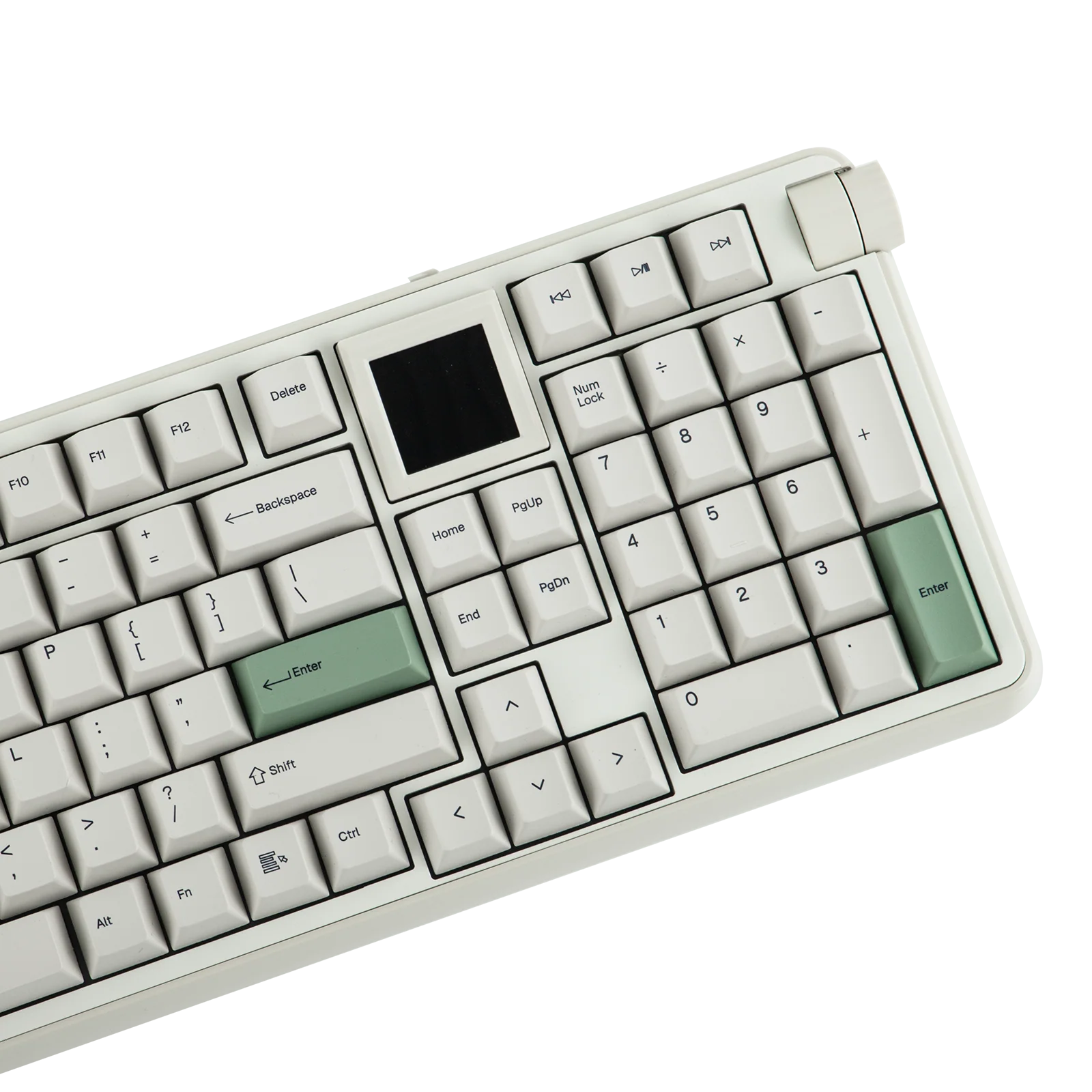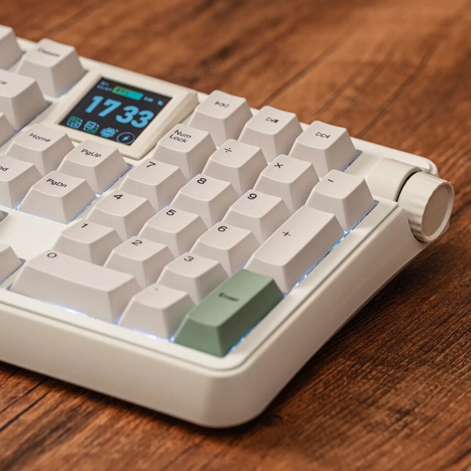 The RT100 Pro arrives in a Retro White color scheme that uses beige tones paired with green accent keys. One of its unique features is a 1.54-inch square TFT display positioned on the keyboard. The display module can be removed if users prefer to replace it with additional switches.