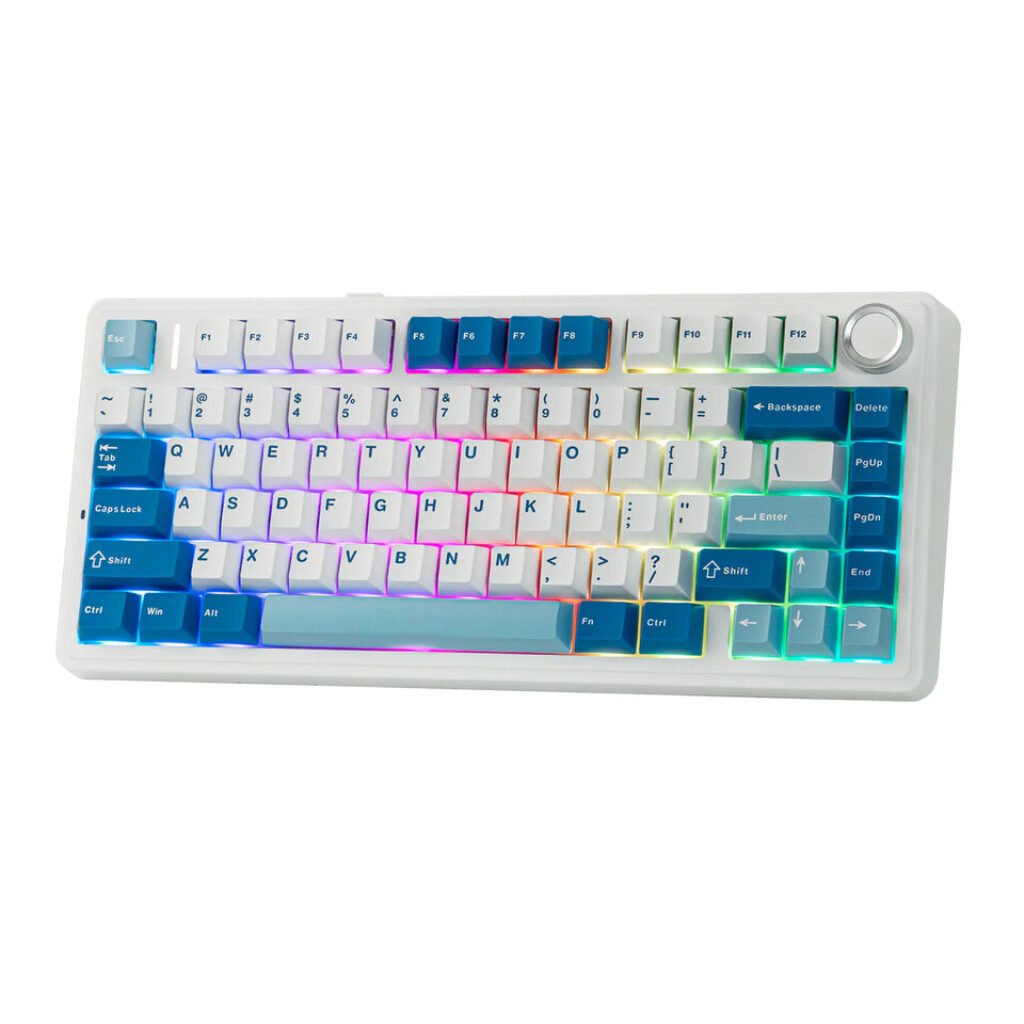 Epomaker offers two visual options for the F75 Ultra. One version uses smoky translucent polycarbonate keycaps on a black chassis, while the second version uses white and blue PBT keycaps on a white body. The keyboard is listed on Epomaker’s website at $84.99.