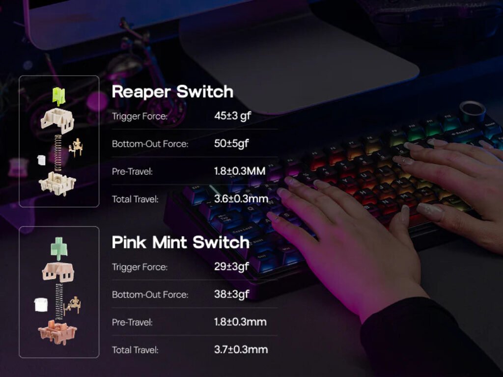 Buyers can choose between two switch options. The Leobog Reaper switches have a 45–50 gf actuation force with 1.8 mm pre-travel, while the Strawberry Mint switches offer a lighter 29–38 gf actuation force with the same pre-travel distance. The keyboard also features south-facing per-key RGB lighting.