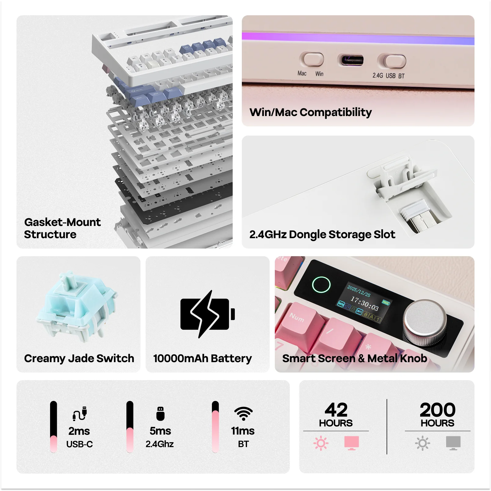 The TH99 PRO is available with either Cloud Jade switches or Sea Salt Silent switches. It comes equipped with original-height PBT keycaps manufactured using double-shot injection molding for long-term durability. Connectivity options include wired USB-C, 2.4GHz wireless, and Bluetooth 5.0, allowing the keyboard to be used across multiple devices.