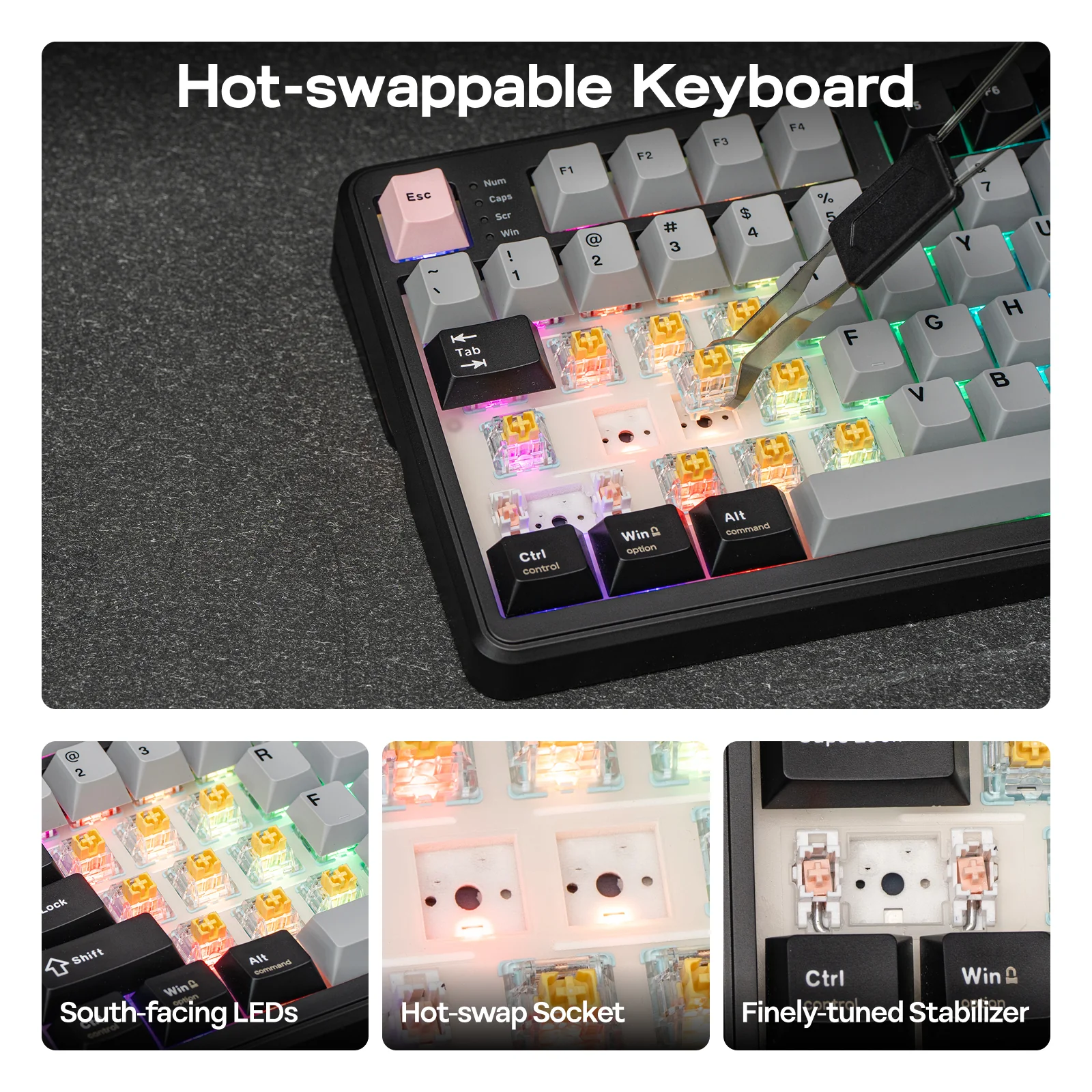 EPOMAKER has opted for a gasket-mounted internal structure, paired with a 1.2mm slotted hot-swappable PCB designed for easier switch replacement. The PCB is combined with a PC slotted positioning plate and five layers of internal filler, which are intended to improve typing feel and reduce unwanted noise during use.