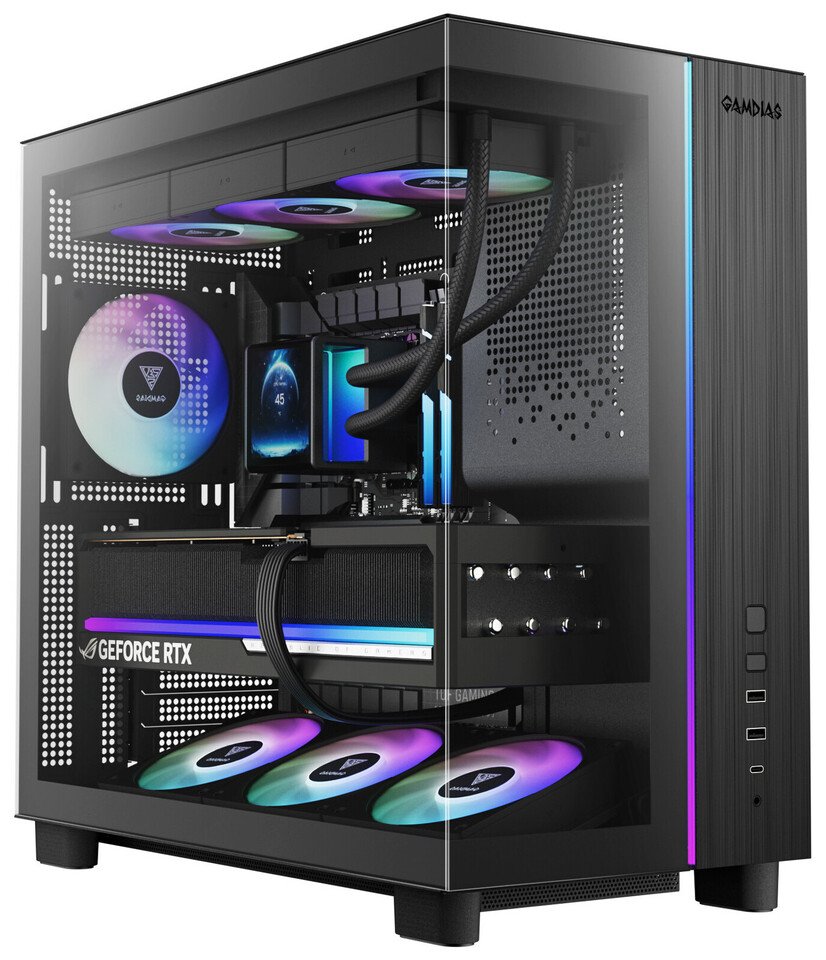 The ATLAS M4 uses tempered glass panels on both the front and side, offering a full internal view from top to bottom. A front-mounted power supply design moves the PSU away from the traditional lower chamber, removing visual obstructions inside the case. Power connectors are positioned downward, while an included extension cable routes connectivity to the rear, helping maintain a clean internal layout.
