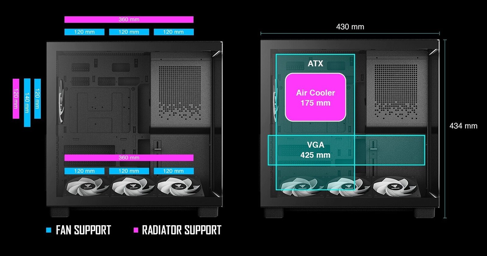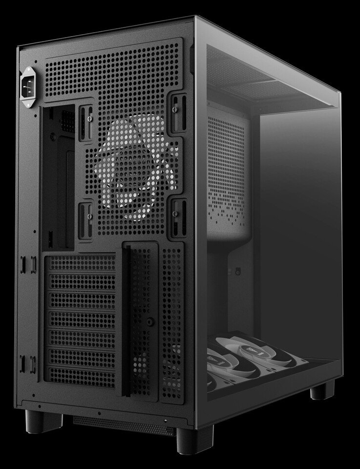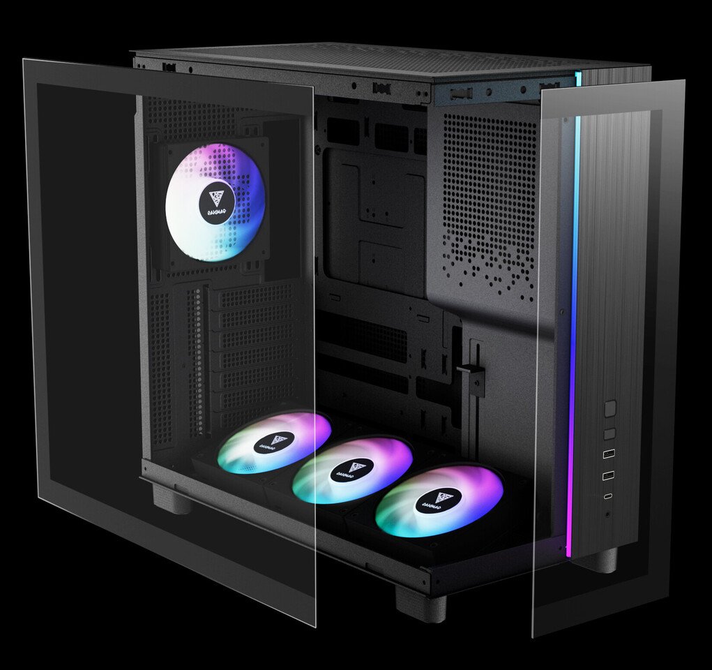 The chassis supports ATX, microATX, and Mini-ITX motherboards and is compatible with connector-hidden board designs, allowing cables to be routed entirely from the rear. Modular, tool-free panels provide easy access during installation or upgrades. A pre-installed GPU support bracket is included to stabilize graphics cards up to 425 mm in length.