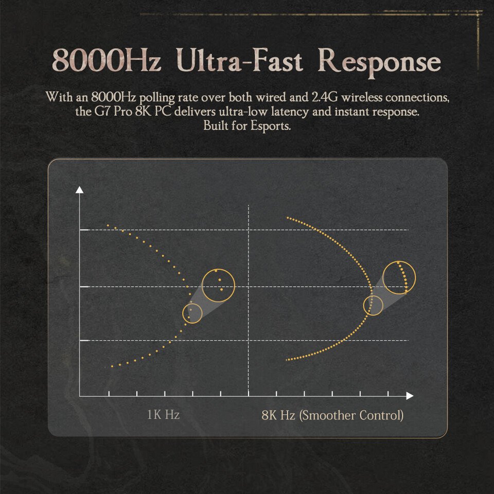 The G7 Pro 8K PC operates with an 8000Hz polling rate across both wired and 2.4GHz wireless modes, enabling exceptionally fast communication between the controller and the system. By refreshing input data up to 8000 times per second, it significantly cuts down input latency, ensuring that button presses and analog stick movements are registered almost instantly.
