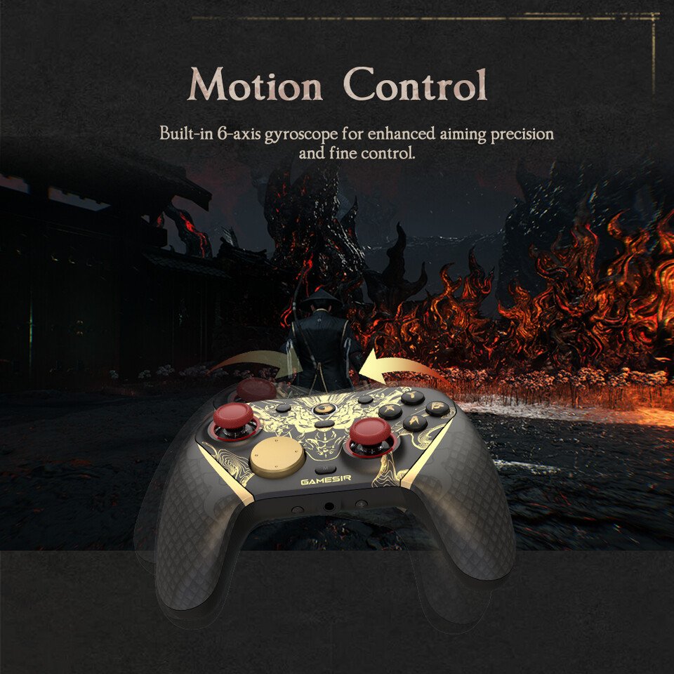 For feedback, the controller features dual asymmetric motors in the grips, paired with an instant start-stop circuit to produce clearer vibration effects. A built-in 6-axis gyroscope adds motion control capability for compatible PC titles. Customization is handled through GameSir Connect software, which allows users to adjust performance settings, remap buttons, and fine-tune sensitivity.