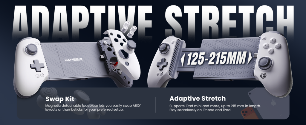 The G8+ MFi features GameSir’s movable Type-C connector, allowing users to connect their devices directly for a low-latency experience. The plug-and-play design removes the need for pairing or charging the controller separately. Pass-through charging support allows users to keep their devices powered during gameplay, which is useful for longer sessions. With support for devices up to 215 mm in length, the controller can accommodate many phones and tablets, including the iPad mini.