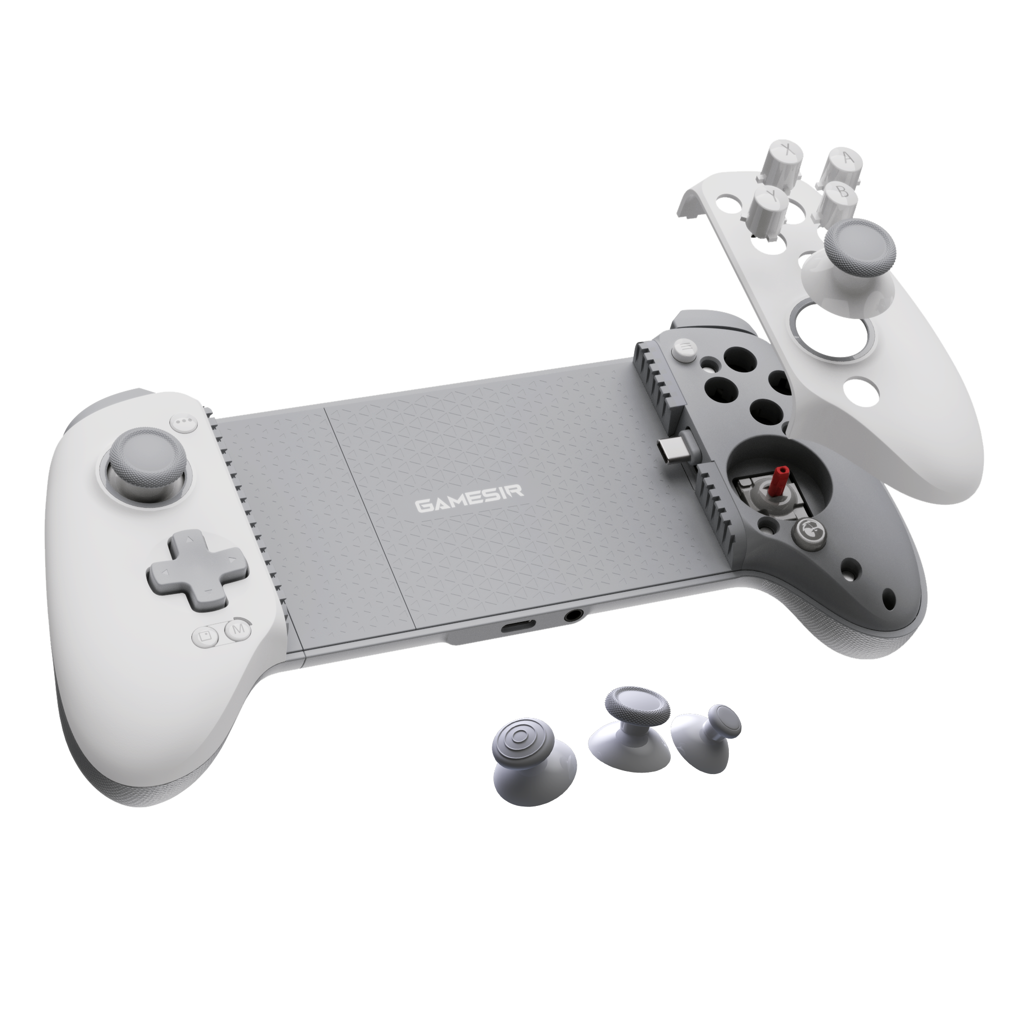 In terms of design, the controller adopts a gray-and-white color scheme with a clean, minimal look. The full-size layout is paired with laser-textured grips, which are designed to improve handling and reduce fatigue during extended use. The overall form factor is intended to replicate the feel of a traditional console controller while remaining suitable for mobile and tablet gaming.