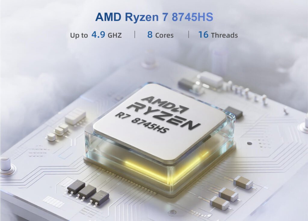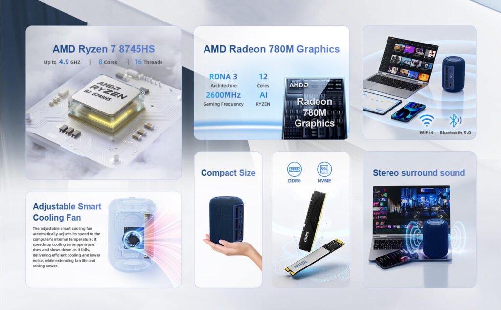 Under the fabric-covered chassis, the GTBox T1 is powered by an AMD Ryzen 7 8745HS processor paired with Radeon 780M graphics, 32 GB of DDR5 RAM, and a 1 TB PCIe SSD. This setup provides solid performance for general computing, multitasking, and even light gaming or creative workloads. The choice of AMD’s latest mobile platform allows for efficient power usage while keeping thermals in check through a compact active cooling system.