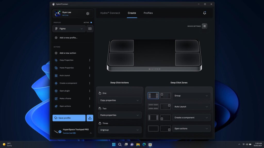 The included Hydra Connect software allows users to personalize how the trackpad behaves across various applications. It supports the creation of custom click zones, corner shortcuts, and application-specific profiles that switch automatically depending on the active program. The Trackpad Pro comes pre-loaded with profiles for popular creative and productivity tools such as Adobe Premiere Pro, Illustrator, Photoshop, Microsoft Office, and Figma. The Hydra Widget offers an on-screen interface for easy access to settings and live adjustments.