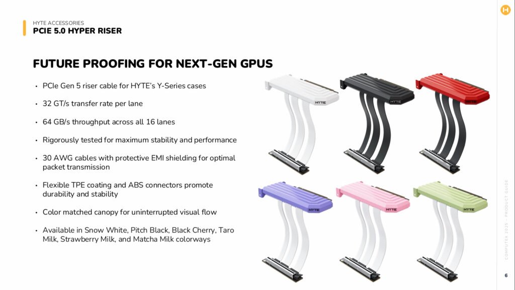 Beyond technical performance, HYTE has paid attention to the visual design of the Hyper Riser. The adapter is available in six color variants: Snow White, Black, Wild Cherry, Strawberry Milk, Taro Milk, and Matcha Milk. These colors are designed to match HYTE’s line of colorful chassis, allowing builders to create visually coordinated setups.