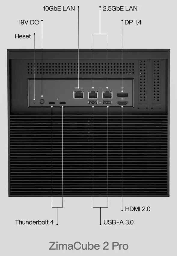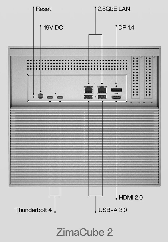 The ZimaCube 2 measures 240 x 221 x 220 mm, keeping the footprint manageable while still allowing room for high-capacity storage configurations. The system includes six drive bays compatible with both 3.5-inch and 2.5-inch drives using SATA III or NVMe interfaces. In addition, up to four M.2 slots are available for SSD storage, bringing the maximum supported capacity to 164 TB depending on the selected configuration and drive sizes.