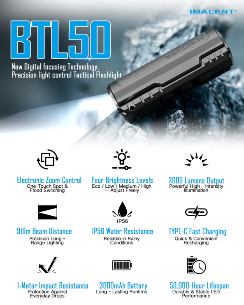 According to the campaign details, the IMALENT BTL50 delivers a maximum output of up to 3000 lumens and offers a beam distance reaching approximately 916 meters. This level of brightness places it among performance-focused compact flashlights intended for users who require strong illumination without moving to larger searchlight-style products. The digital zoom function aims to simplify operation by allowing the beam shape to be adjusted through the power control interface, removing the need for physical movement of the lens assembly.