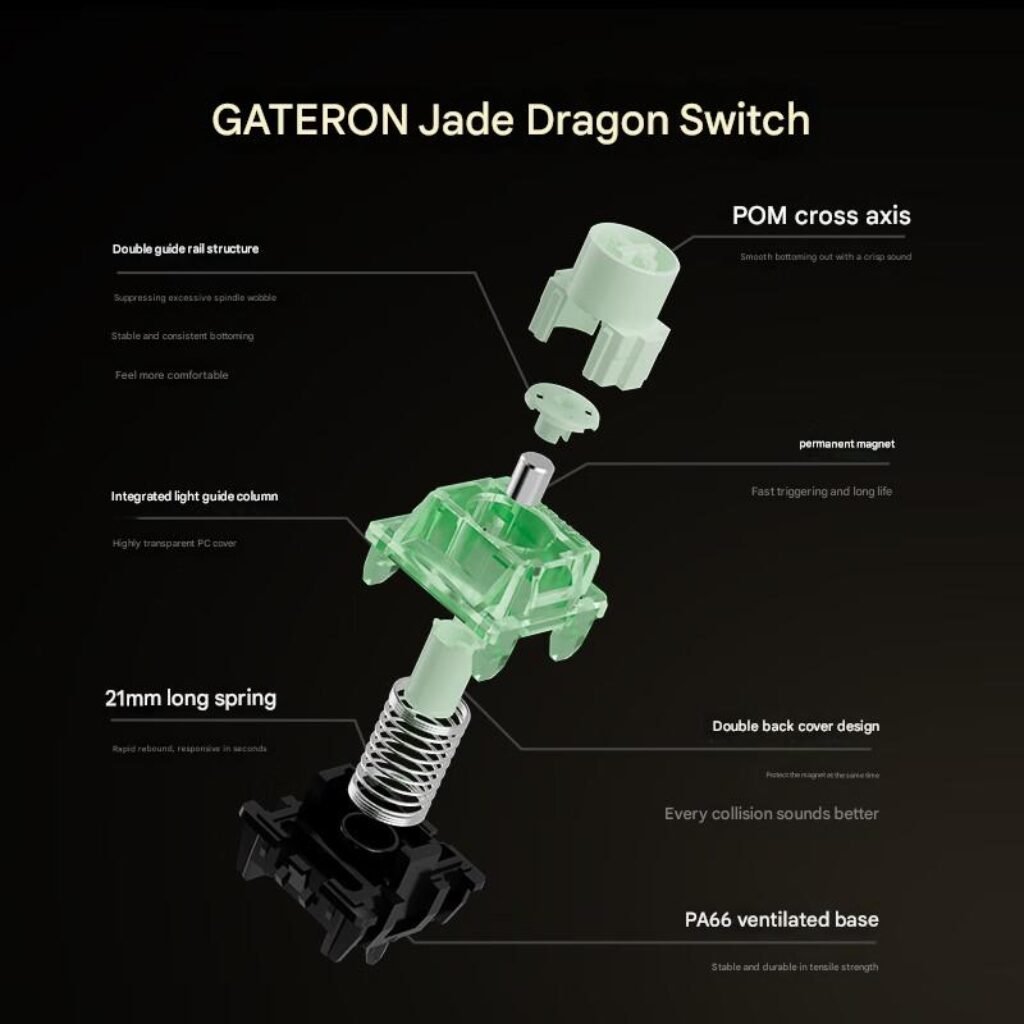 All versions of the NV60 are equipped with Gateron Jade Dragon switches, rated at 33 gf actuation force. These switches use a dual-rail construction combined with a dual-sealed bottom housing designed to reduce stem movement and improve stability during rapid inputs. TMR magnetic sensing removes traditional metal contact points, allowing actuation to be detected through magnetic field changes, which may contribute to long-term consistency and reduced mechanical wear.