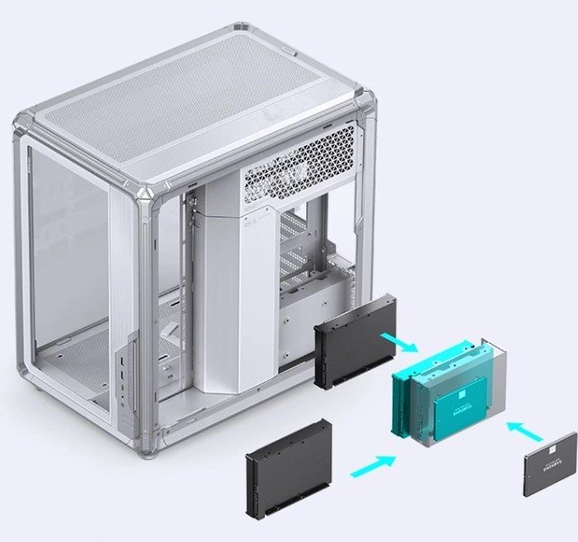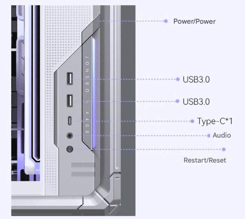 Internally, the X400 WHITE uses a left-right compartment layout with dual transparent glass side panels. This design separates key components while keeping them visible, which is useful for users who want to display RGB lighting or custom cooling hardware. Jonsbo has included a motherboard auxiliary airflow cooling system, enabling the installation of up to two 120 mm fans directly in the motherboard area. These fans can help provide additional airflow to components such as VRMs and memory modules, especially in high-performance systems.