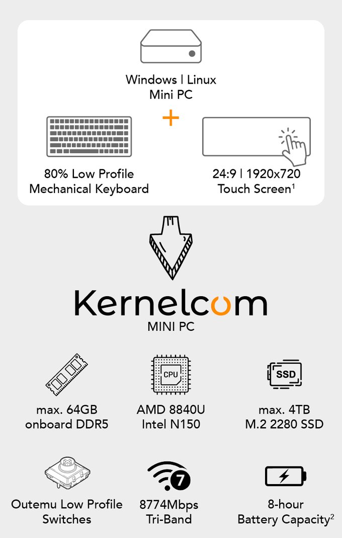 By integrating a low-profile mechanical keyboard and a wide touchscreen into a single portable unit, Kernelcom aims to provide a modern alternative to traditional laptops. The combination of mobility, precise input, and energy-efficient components positions the device as a practical choice for those seeking a versatile mini PC for work and content consumption while on the move.