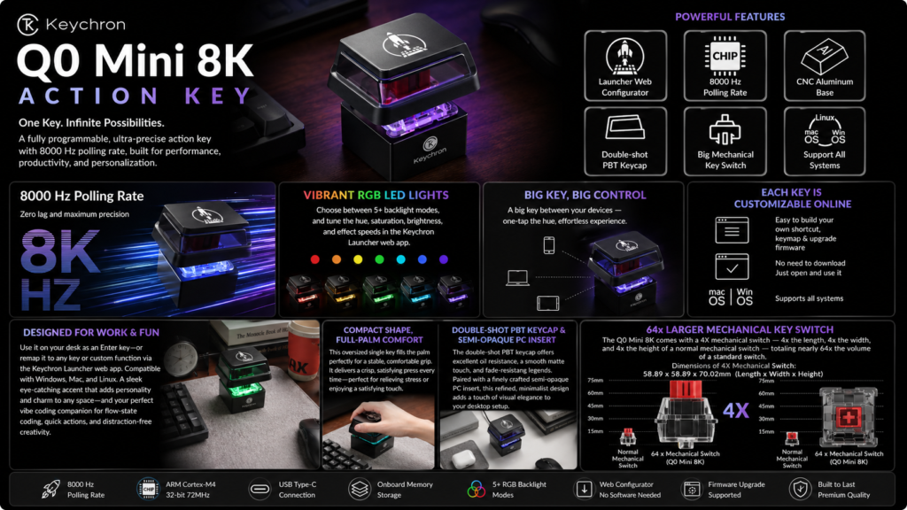 Keychron has expanded its mechanical keyboard portfolio with the introduction of the Q0 Mini 8K, a highly unconventional device that breaks away from the traditional multi-key layout. Instead of a full set of keys, the Q0 Mini 8K is built around a single oversized mechanical switch, designed for niche input applications and experimental control setups.