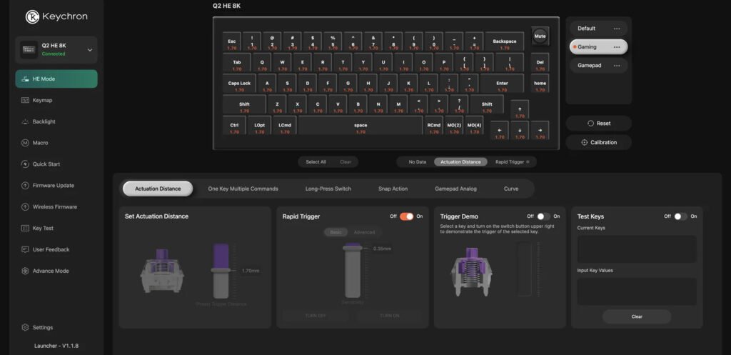 Customization remains a key part of the experience. Through Keychron Launcher, users can access analog features such as Rapid Trigger, SOCD management, Snap Tap, controller emulation, and Mod Tap. Traditional tools like macro creation, layer configuration, and key remapping are available as well. Actuation customization ranges from 0.01 mm to 3.35 mm, with sensitivity adjustable to 0.001 mm, giving users fine control over switch behavior.