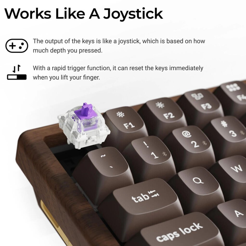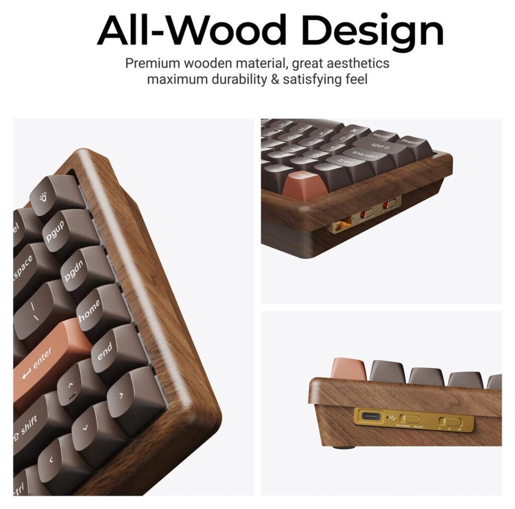 The All-Wood Edition maintains the 75% layout familiar to K2 HE users but replaces the aluminium body with a full wooden enclosure supported by CNC-machined aluminium side panels. The company states that this construction aims to provide a different typing feel and acoustic profile, while still preserving the rigidity needed for a magnetic switch system.