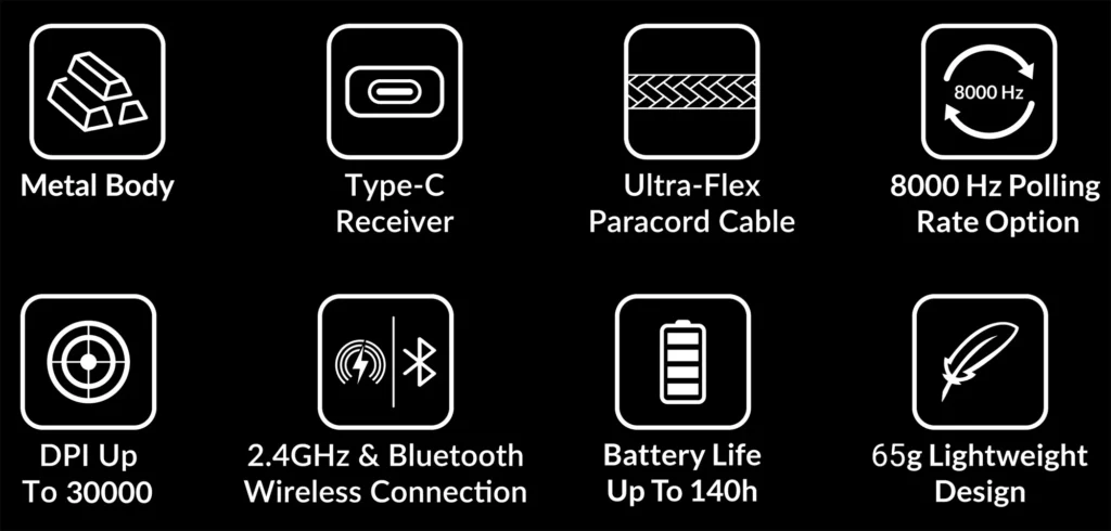 This flexibility makes the mouse compatible with a wide range of devices and use cases. The mouse uses TUNOR 80M microswitches, ensuring consistent responsiveness. It houses a 600mAh built-in battery capable of delivering up to 140 hours of wireless usage in standard mode. When operating at 8kHz, the battery life reduces to approximately 40 hours, still covering multiple days of continuous use