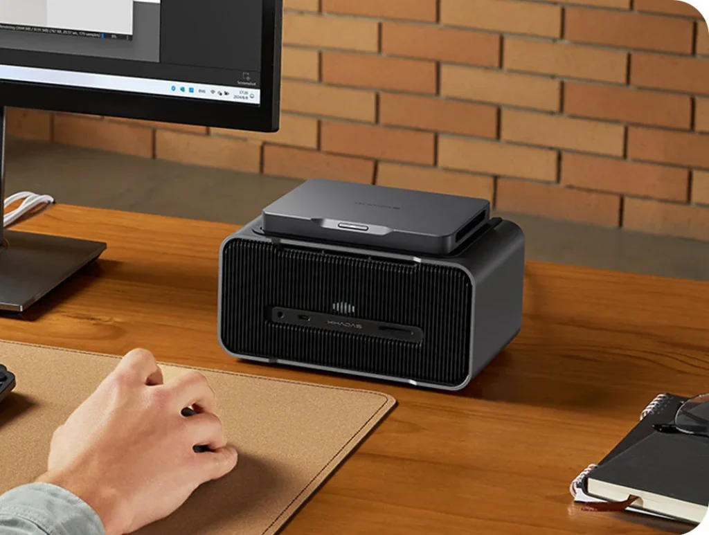 Beyond graphics, the Mind Graphics 2 integrates additional features not commonly found in external GPU enclosures. These include dual speakers, dual microphones, and a fingerprint recognition module. The dock also offers a wide range of I/O options: one USB-C 40Gbps port, one USB-C 10Gbps port, two USB-A 10Gbps ports, two HDMI 2.1b ports, one DisplayPort 2.1b port, a 2.5GbE Ethernet port, a UHS-II SD card reader, and a 3.5mm audio jack.
