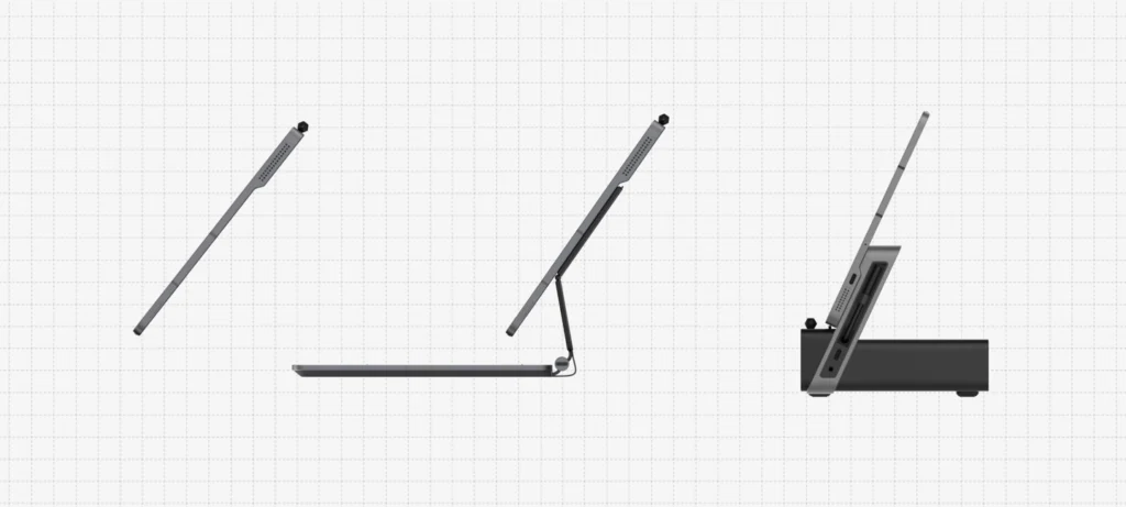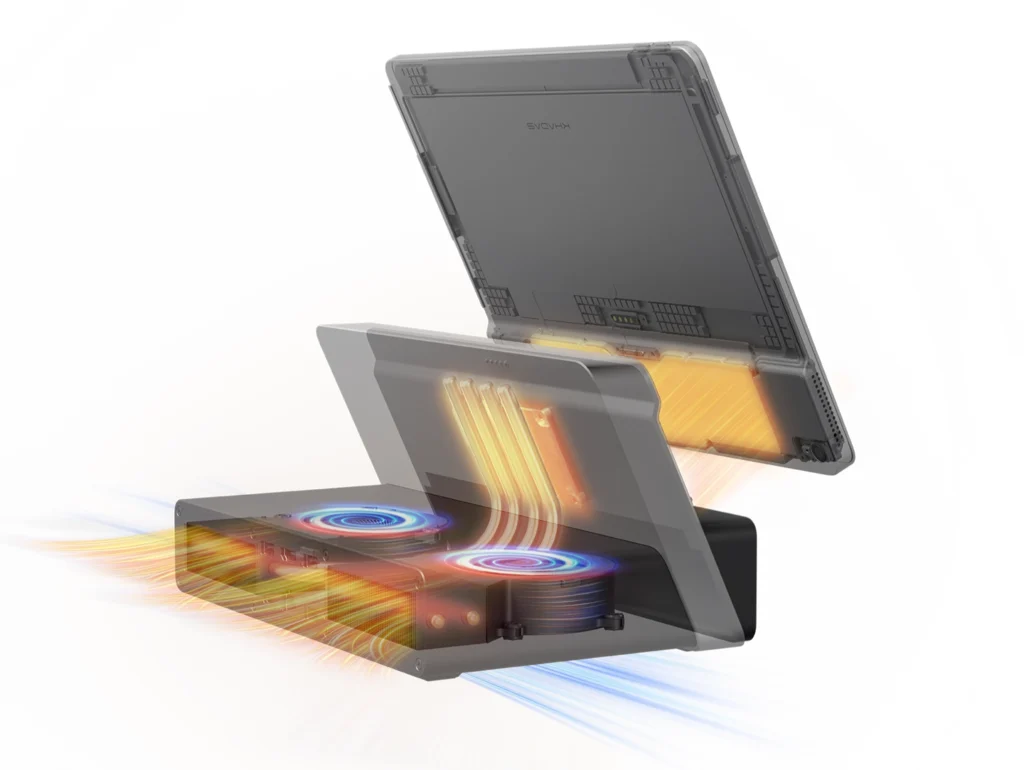 For desktop or mini PC mode, the Mind Go pairs with the Mind Go Stand docking station. This dock expands connectivity options with additional ports and integrates a cooling system, which allows the device to deliver approximately twice the performance compared to tablet mode. This combination provides users with a desktop-like experience in a compact form factor.