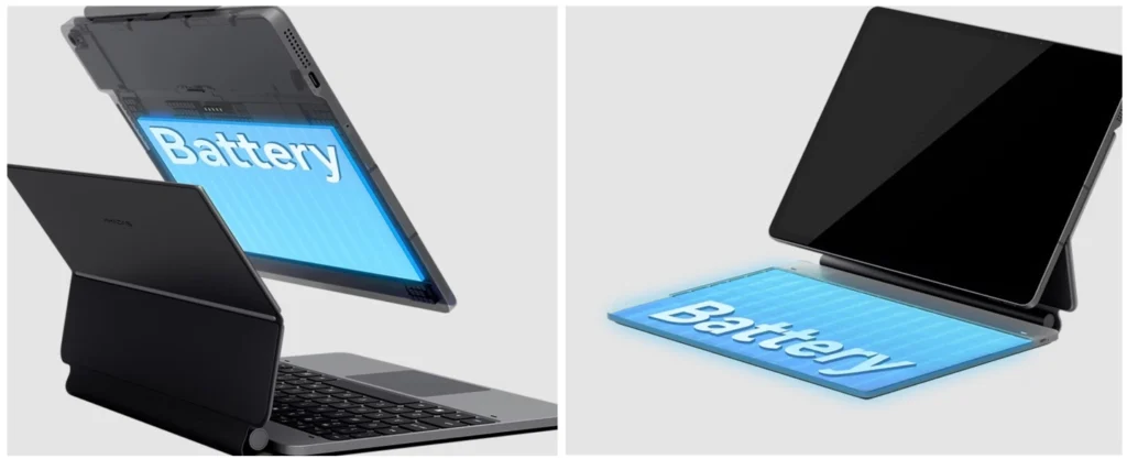 In laptop mode, the tablet connects to a keyboard module with a built-in touchpad. This module also contains a battery, increasing the total capacity to 45Wh. According to Khadas, this setup can provide up to nine hours of local video playback, offering extended use without frequent charging.