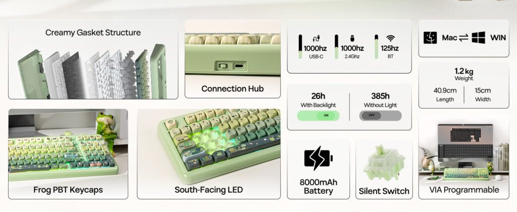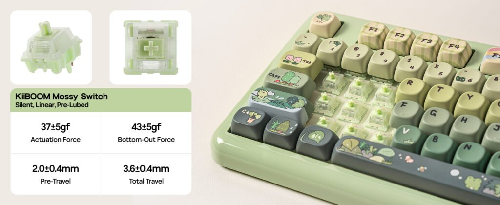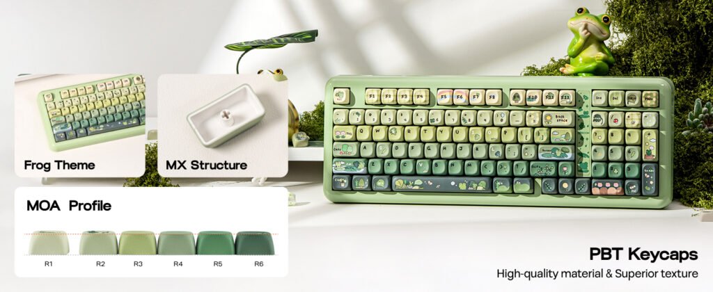 The design places a clear focus on visual identity, with three color options available at launch: Green Rainy Frog, Foggy Translucent, and Pink. Each version uses a combination of a UV-glazed case and PBT dye-sublimated keycaps, creating a layered texture that changes slightly depending on lighting conditions. A magnetic nameplate is also included, which stores the 2.4 GHz wireless receiver and keeps it from getting misplaced during daily use.