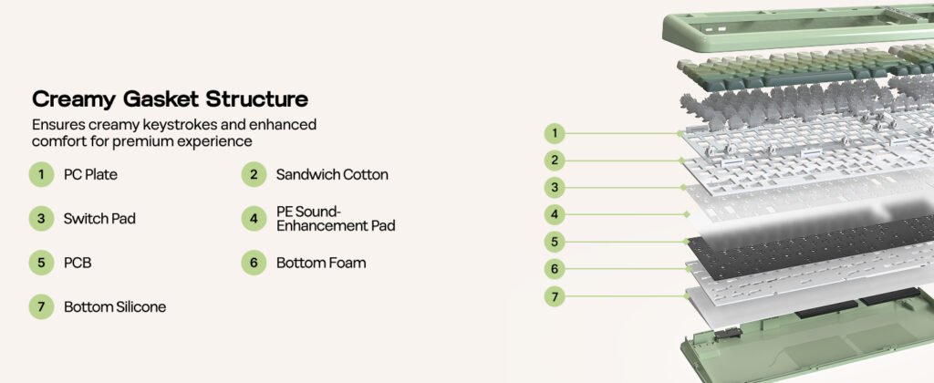 On the structural side, the keyboard uses a gasket-mounted design. This approach is commonly used to soften the typing feel and reduce harsh vibrations, resulting in a more controlled keystroke and a cleaner sound profile. The inclusion of a wider 2U “0” key on the numpad is a small adjustment, but one that can improve consistency during repetitive input tasks such as data entry.