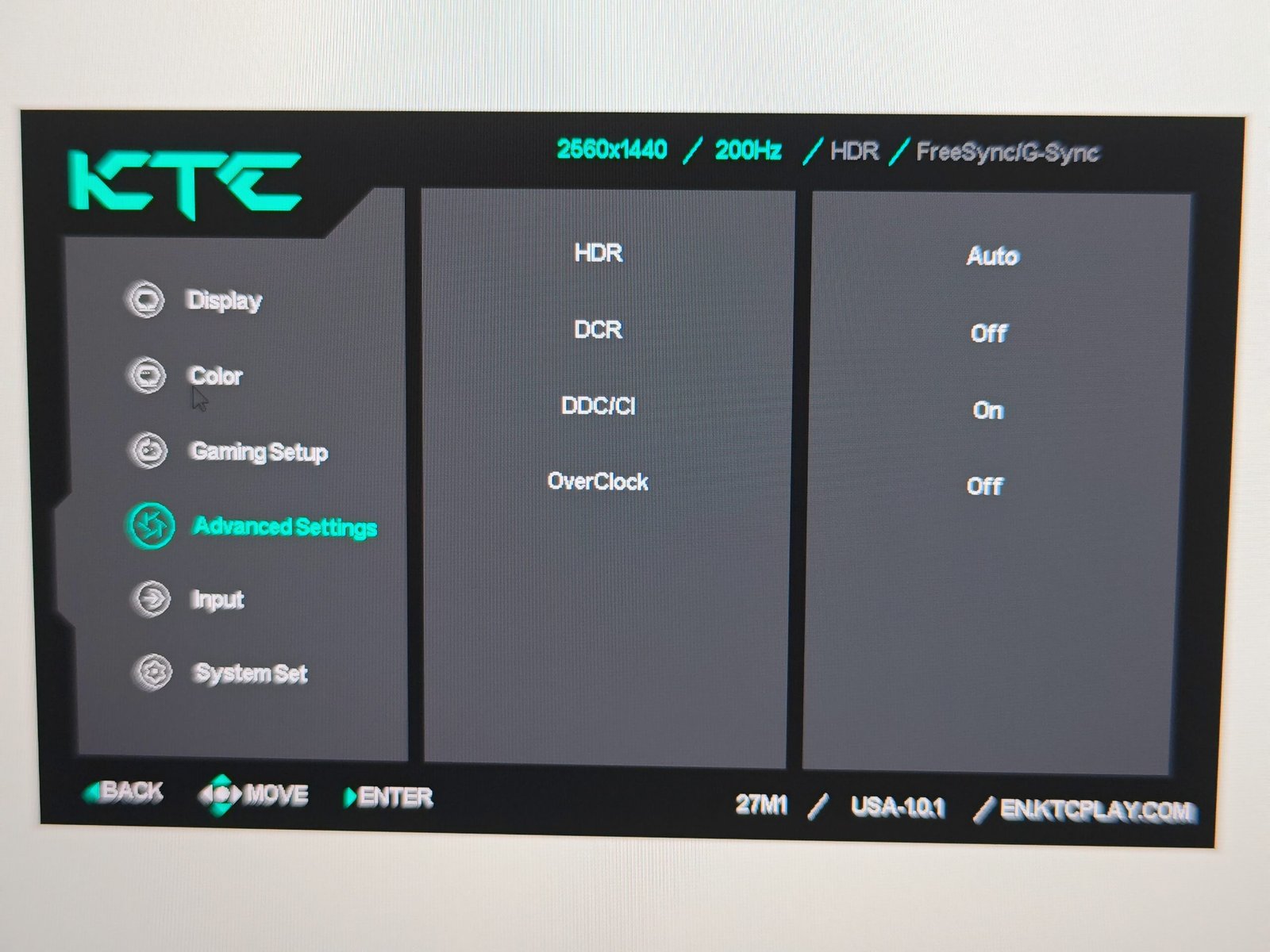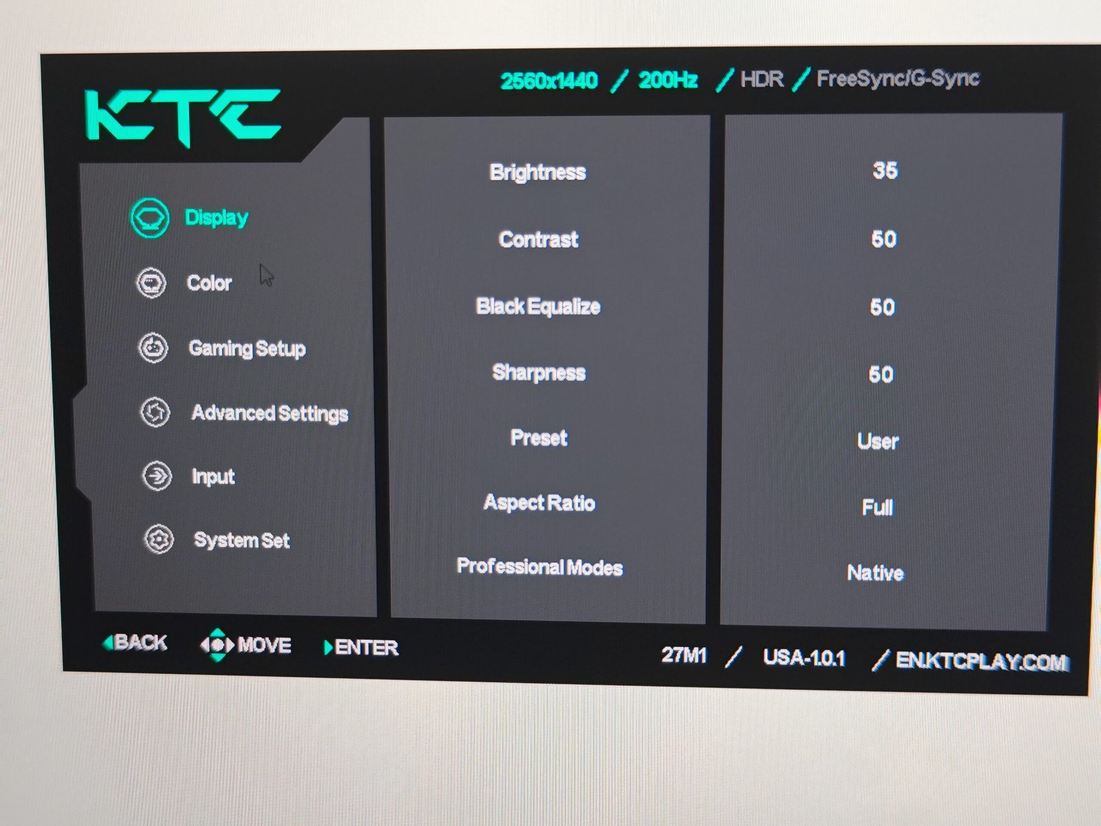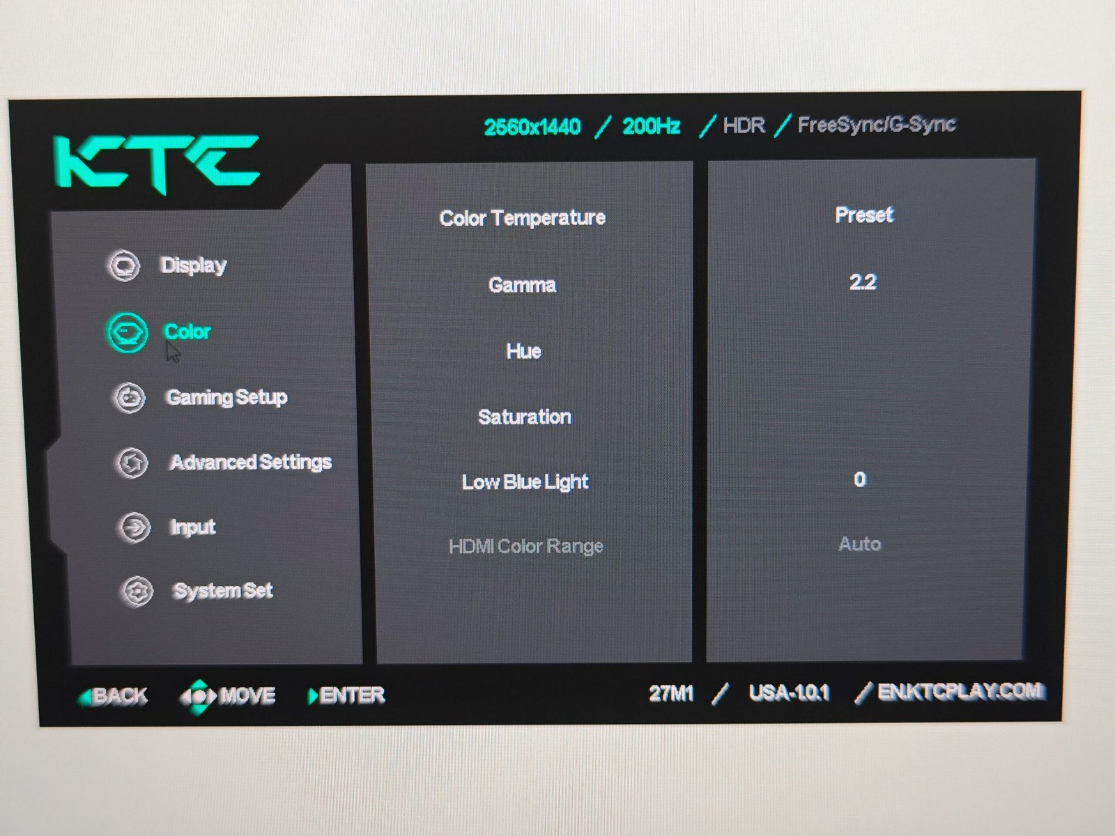 The KTC 27M1 uses a small joystick on the lower-right side for navigating the on-screen display. It is easy to reach and responsive, allowing smooth movement through the menus. The interface itself is clean and well-organized, with clear labels and bold, high-contrast text that makes reading settings simple even in bright lighting. Image adjustments include four gamma presets and basic color temperature options labeled as “Warm” and “Cool,” alongside six-axis color saturation controls for fine-tuning red, green, and blue channels. An sRGB preset is included, but there are no profiles for AdobeRGB, DCI-P3, or Rec.709, which may limit use for professional color work.
