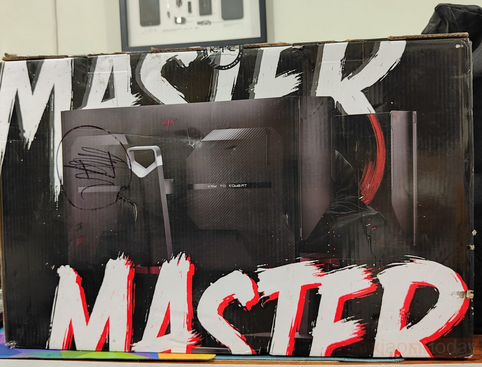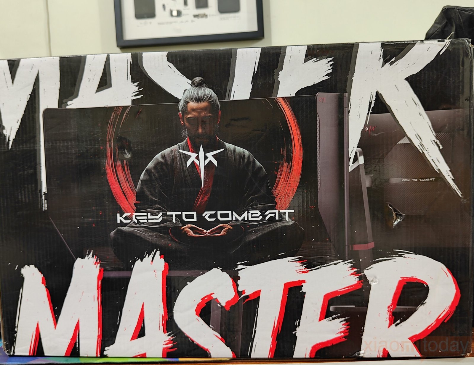 The packaging clearly reflects its focus on gaming, with the front panel featuring the large “MASTER” logo in bold brush-stroke lettering and a central samurai-style graphic set against a glowing red circle. The KTC logo and “KEY TO COMBAT” slogan are integrated into the design, while the monitor itself is shown in the background, highlighting its slim bezels and streamlined stand. The black, white, and red color scheme maintains a clean and cohesive presentation. On the back, the branding continues, shifting attention to the rear design of the monitor. Dark backgrounds with red particle effects maintain a consistent, gaming-oriented look across both sides of the box.