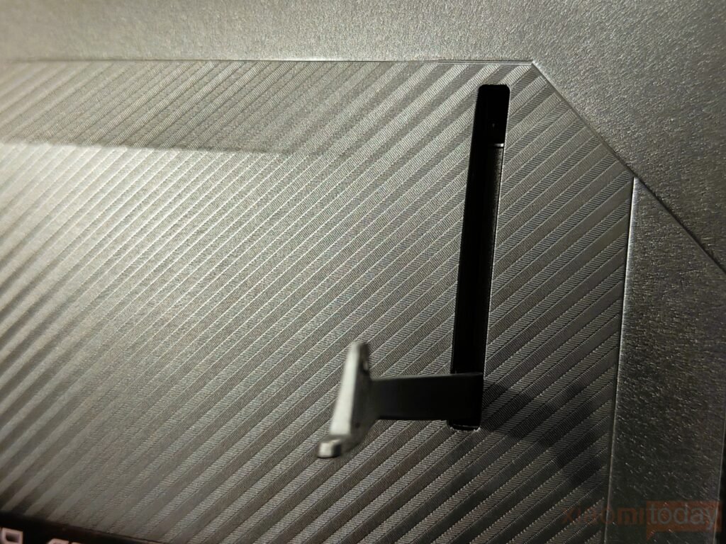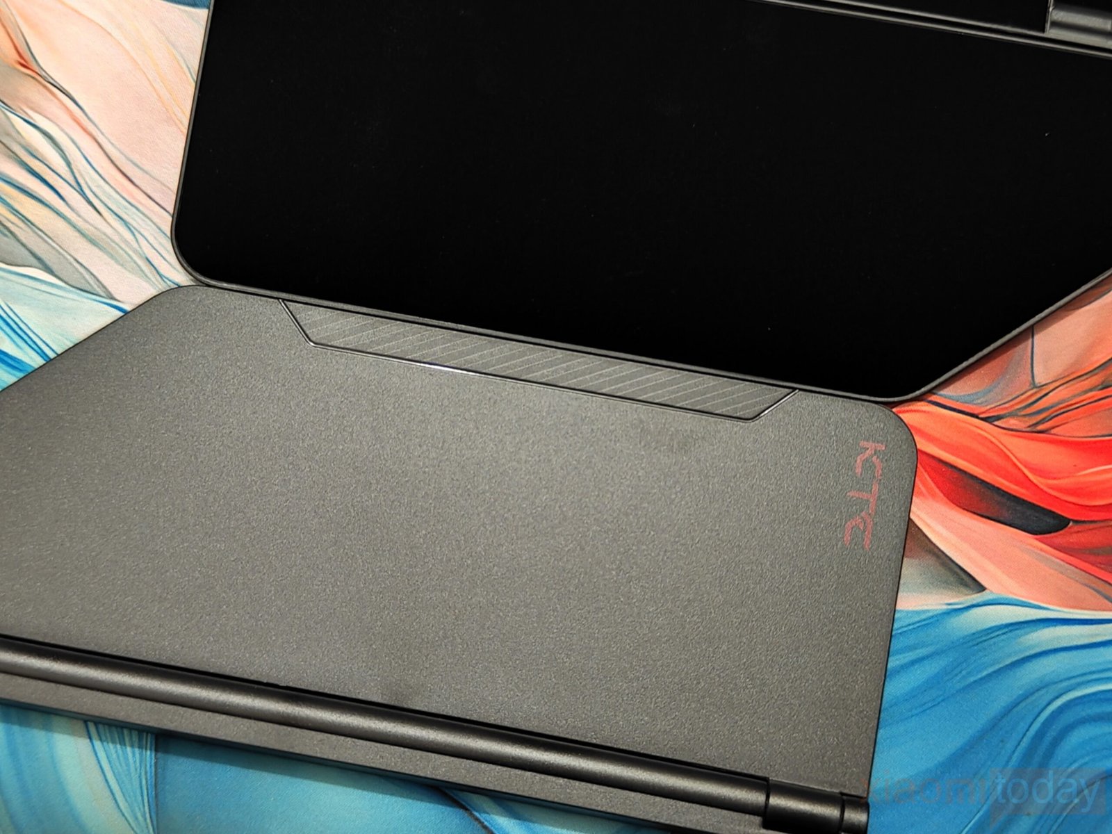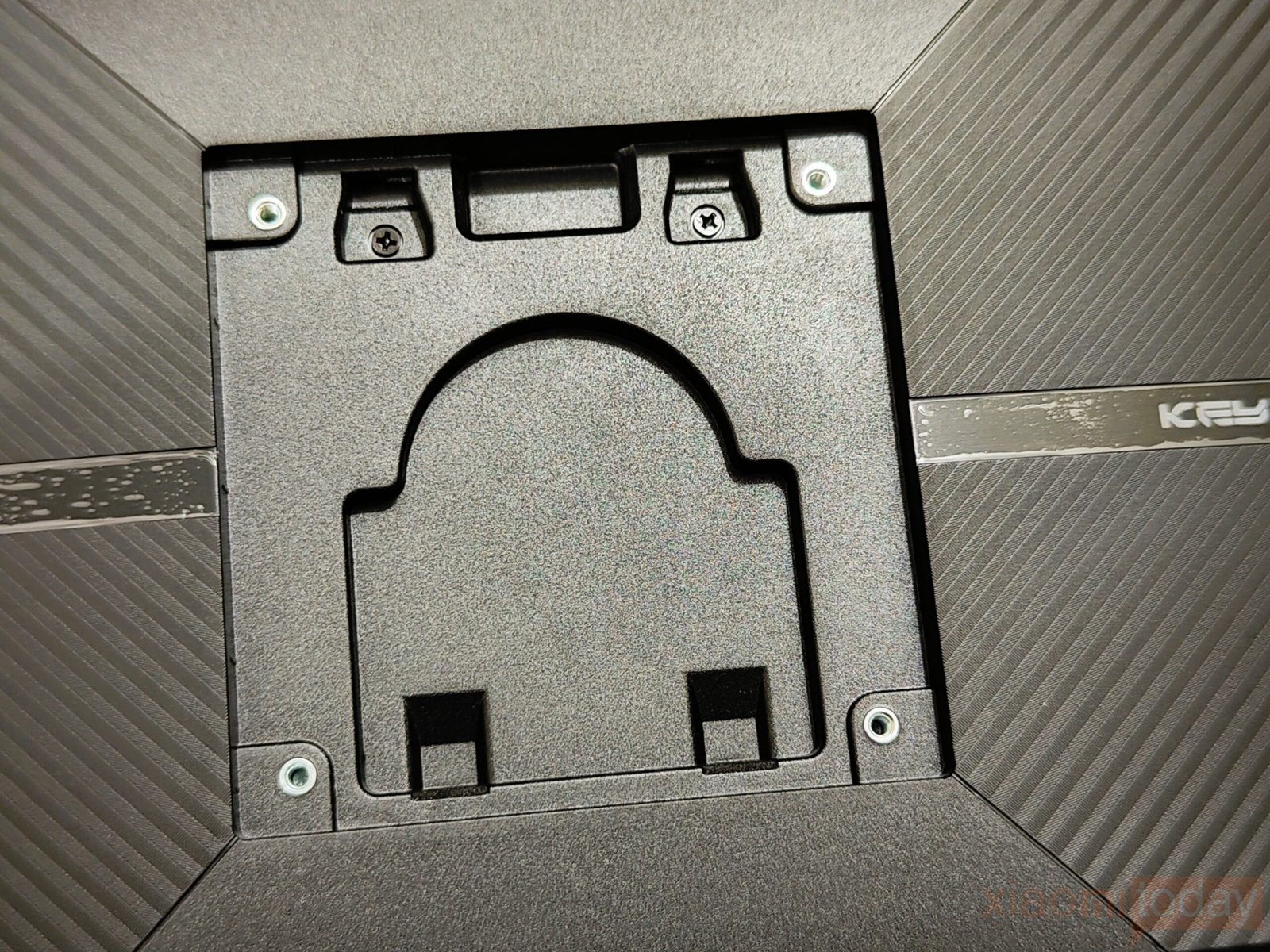 The rear of the monitor carries a more aggressive gaming theme. The matte-black plastic housing is paired with carbon-fiber textured sections that add visual detail without looking excessive. A silver horizontal accent strip engraved with “KEY TO COMBAT” runs across the center, positioned below the red KTC Master trident logo. While clearly gamer-focused, the overall design remains tidy and well-balanced.