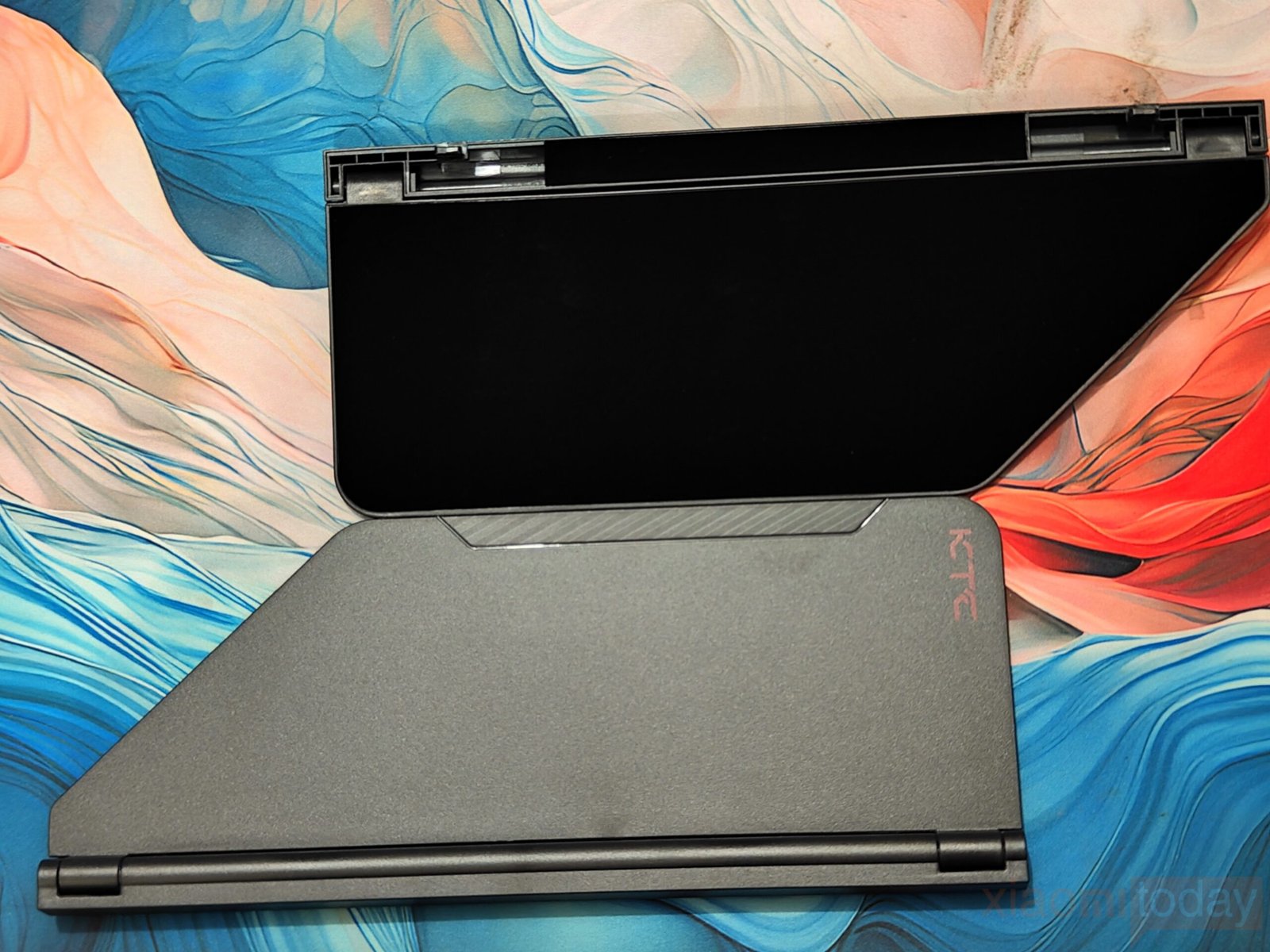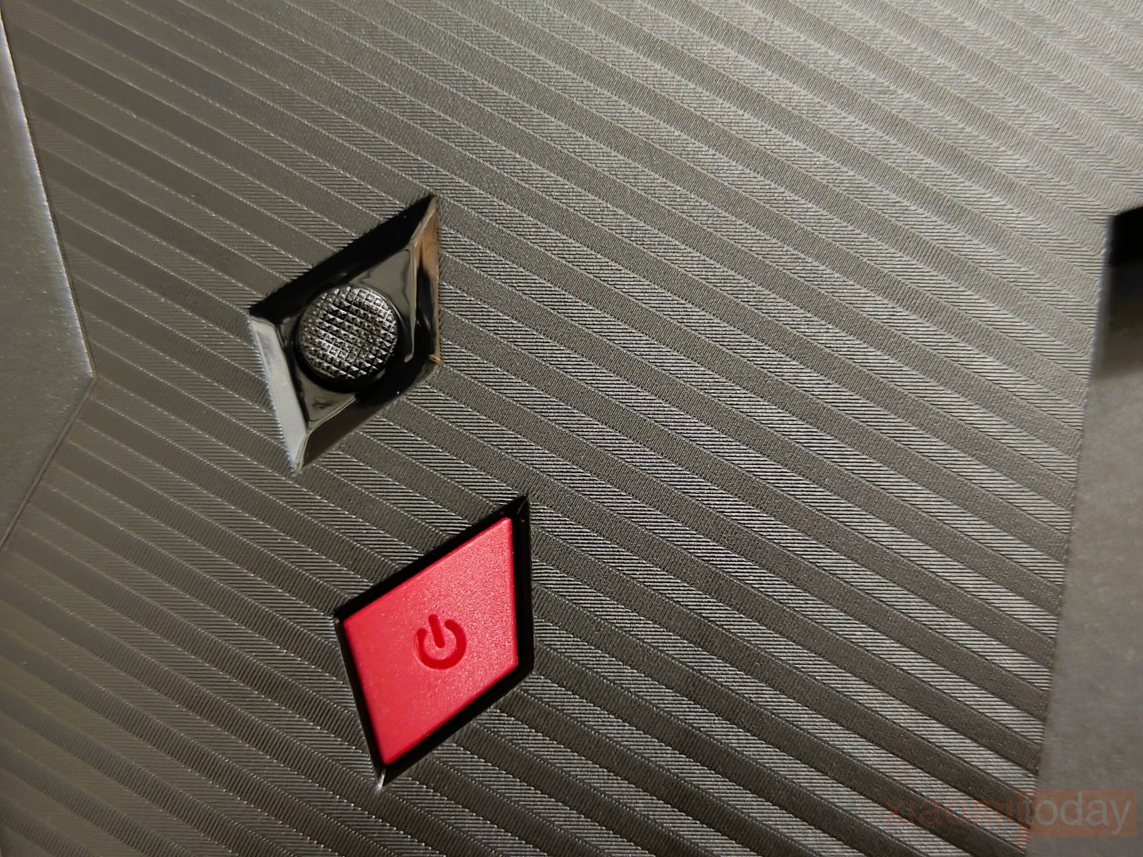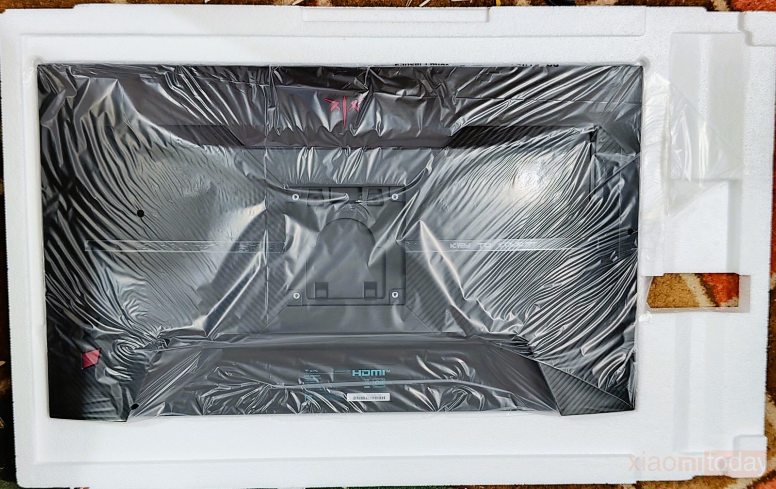 The rear of the monitor carries a more aggressive gaming theme. The matte-black plastic housing is paired with carbon-fiber textured sections that add visual detail without looking excessive. A silver horizontal accent strip engraved with “KEY TO COMBAT” runs across the center, positioned below the red KTC Master trident logo. While clearly gamer-focused, the overall design remains tidy and well-balanced.
