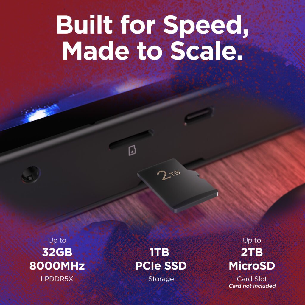 System memory has been doubled to 32 GB of LPDDR5X-8000, while storage options include a 1 TB PCIe drive with support for up to 2 TB via microSD expansion.