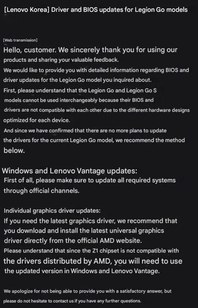 Lenovo’s original Lenovo Legion Go handheld is reportedly reaching the end of its official driver update cycle, according to a statement issued by Lenovo Korea and shared on local community forums. The company confirmed that there are currently no plans to release additional driver updates for the device. Instead, users are being advised to install system updates through Windows Update and Lenovo Vantage, and to rely on AMD’s official website for graphics driver downloads when necessary.