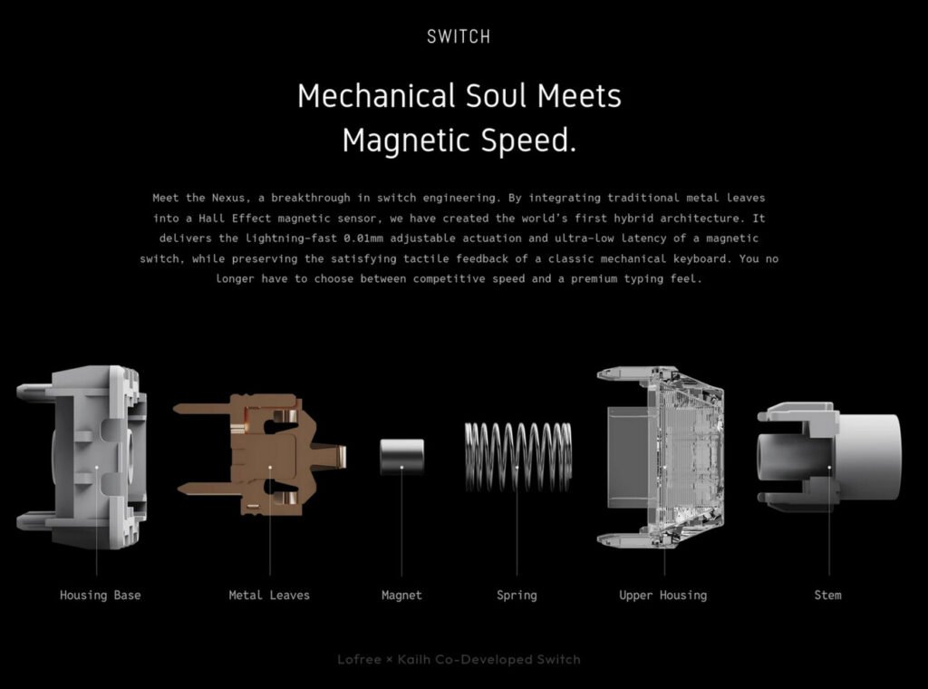 The Hyzen keyboard introduces the new Nexus switch, developed in collaboration with Kailh. The switch integrates a magnet inside the stem alongside traditional metal contacts, enabling it to operate as both a mechanical and TMR-based magnetic switch. According to Lofree, this hybrid structure delivers the tactile feedback typically associated with mechanical switches while also supporting adjustable actuation distance and analog input capabilities commonly found in magnetic designs. The combination offers added flexibility for users seeking faster response times or the ability to fine-tune key sensitivity based on their preferences.